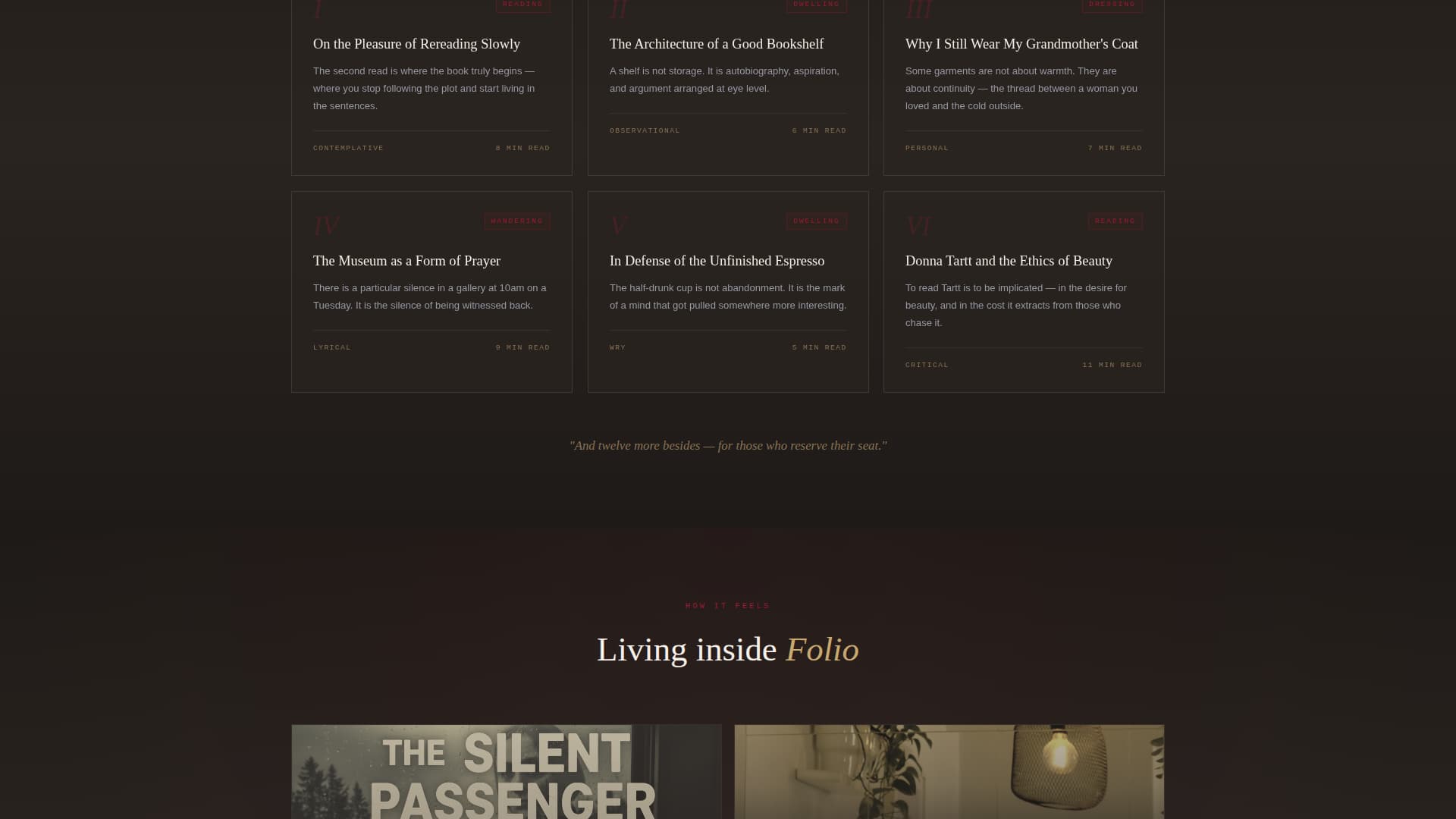 Folio is a single-page, card grid landing page template designed for a light academia lifestyle blog. It opens with a pulsing Spotlight header and unfolds like a slow cinematic reel, moving visitors through content pillar cards and essay previews before delivering them to a waitlist form. Every visual choice reinforces one feeling: you have stepped inside a world worth staying in.
