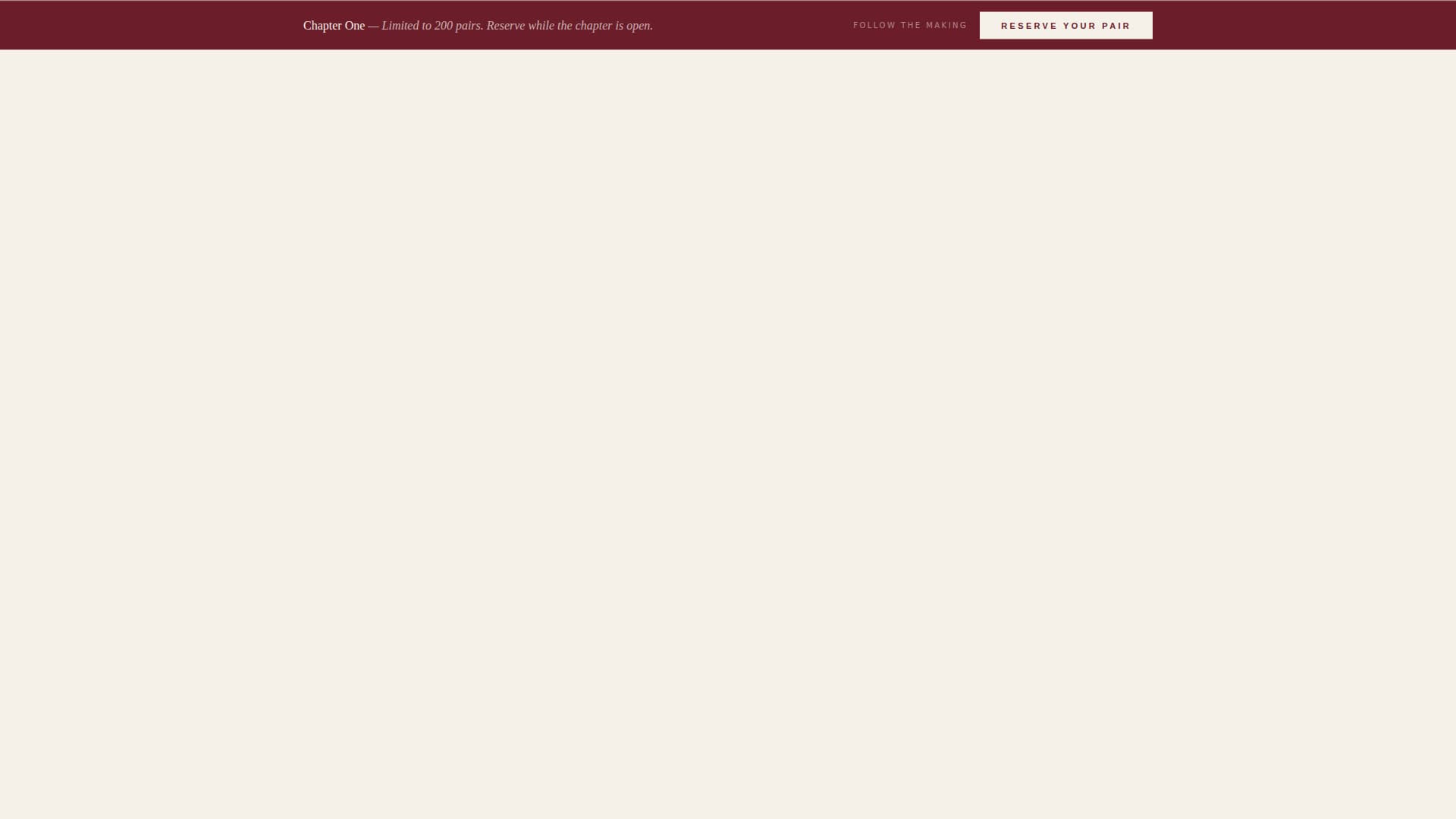 Urgency is communicated through craft-tied scarcity language rather than countdown timers. The phrase "Limited to 200 pairs per chapter" anchors the emotional weight built by the creator stories, making the waitlist feel like a meaningful commitment rather than a routine sign-up.