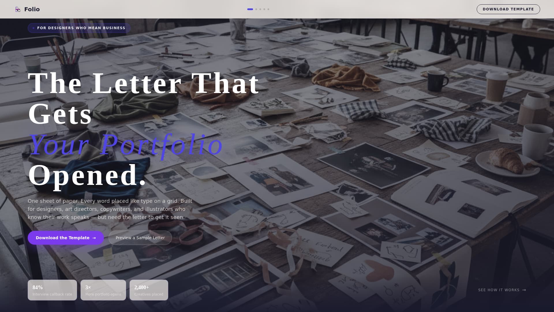 A large-format creative workspace photograph, slightly desaturated, anchors the hero panel. A bold serif headline reads "The Letter That Gets Your Portfolio Opened" in electric indigo, kerned wide and scaled edge to edge. The type and image are balanced so neither element overpowers the other.