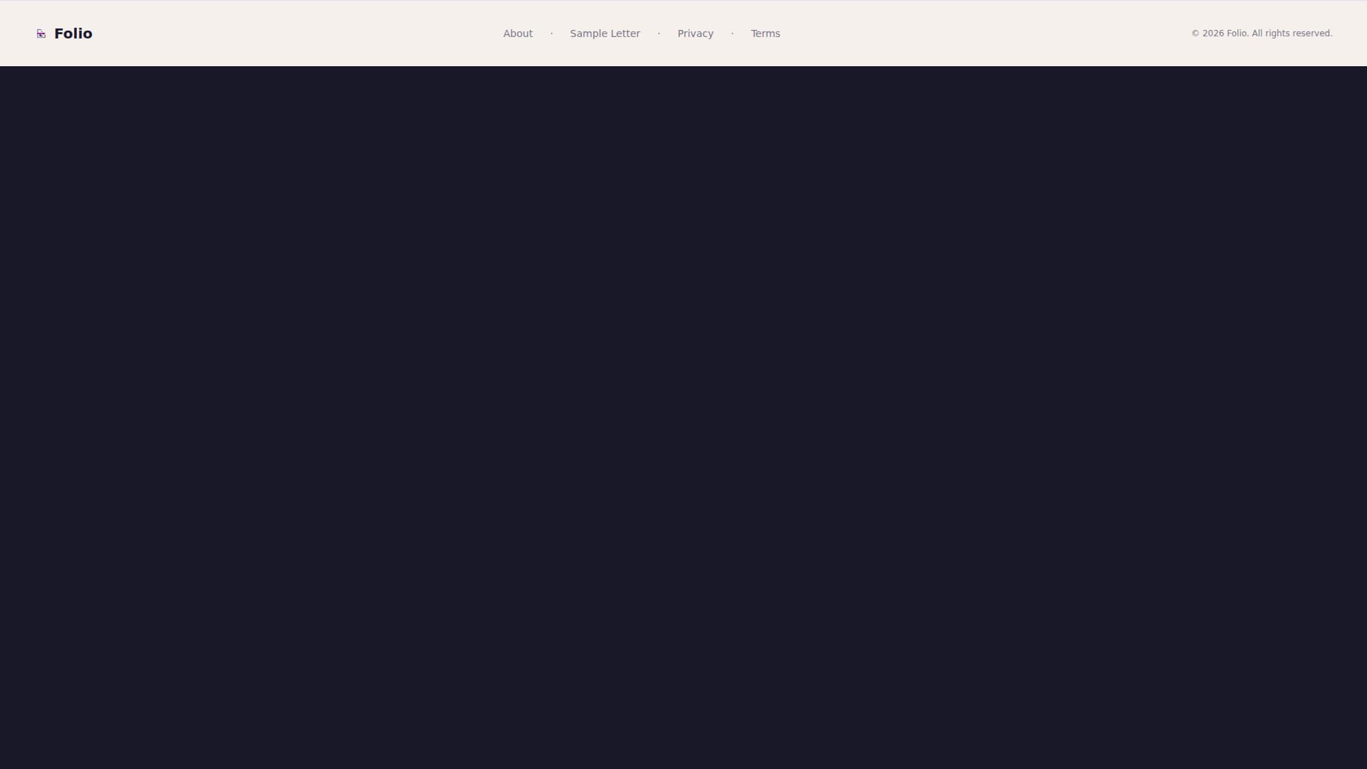 The Folio landing page is a fully designed, single-page horizontal scroll experience. Every panel is intentional, building a case for the cover letter template through real proof and transparent previews.