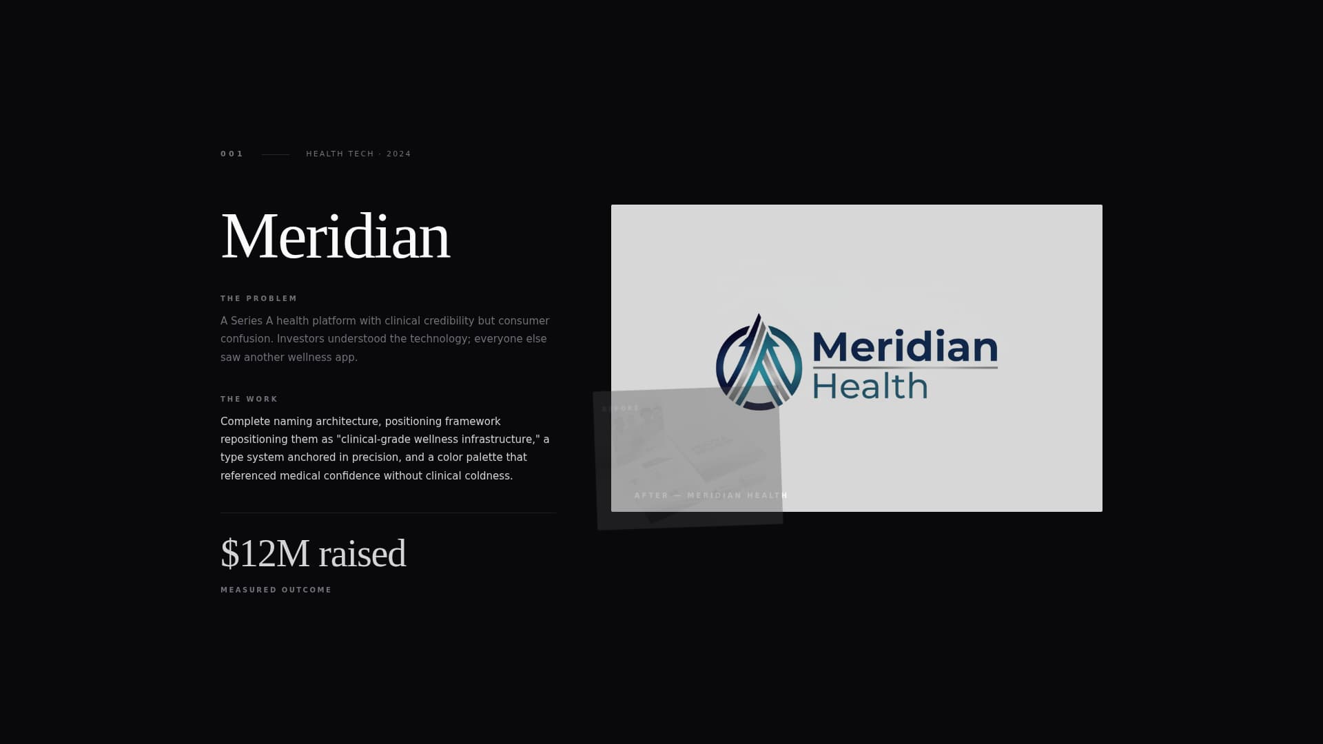 Every case study opens with the original brand: old logo, cluttered messaging, forgettable palette, presented small and dim. As the visitor scrolls, the rebuilt brand system expands: the new mark, the type system, the color architecture, and a single hero application. The contrast does the persuading.