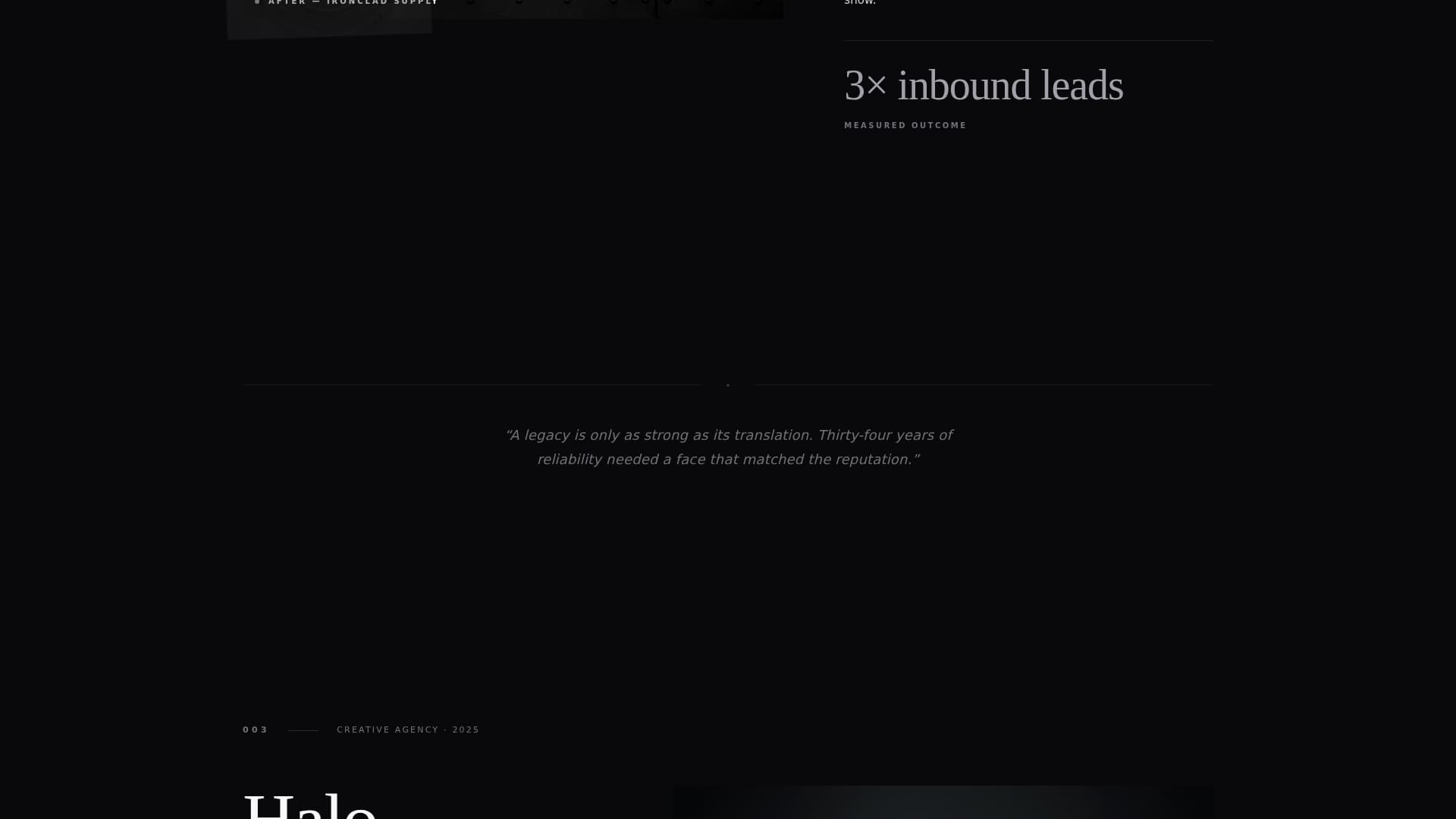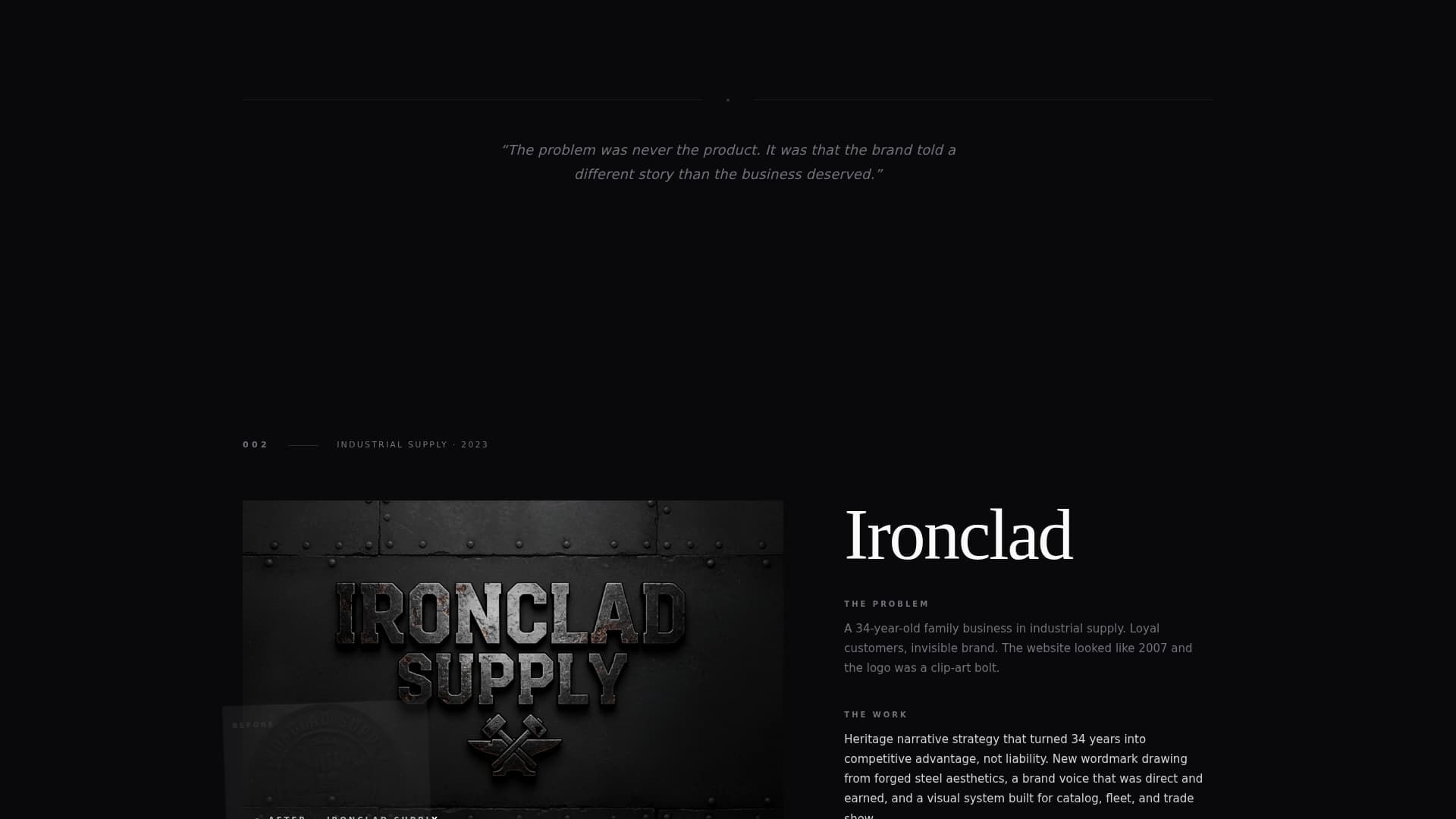 Each scroll increment reveals one case study as a full-viewport painting. The visitor moves through work in sequence, witnessing each brand before it was rebuilt and then watching the after system expand to fill the screen. Between cases, a void-black breathing space holds a single sentence of strategic rationale in steel gray. The rhythm is silence, then revelation, repeated.