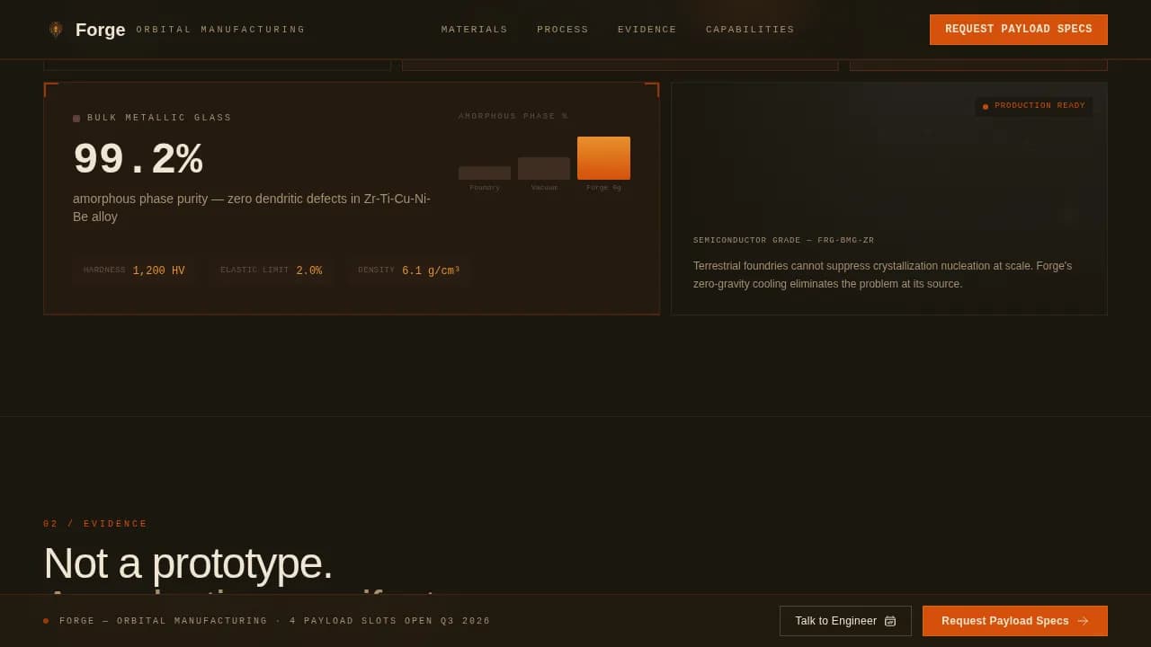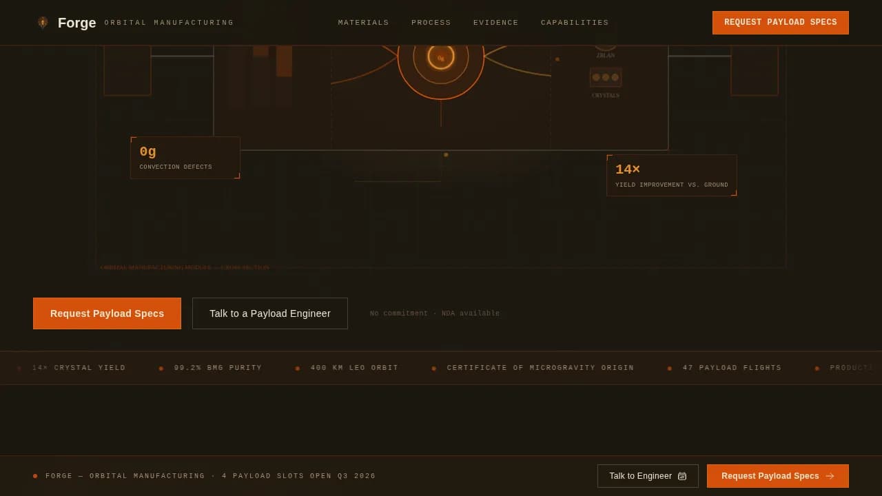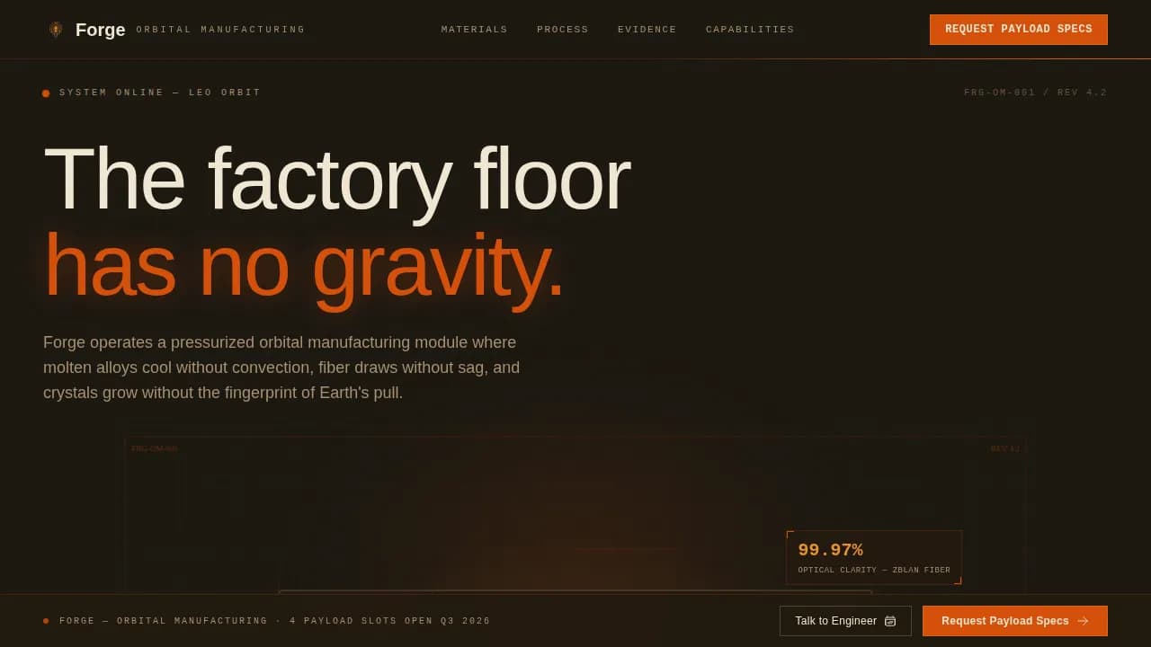 Forge is a single-page, click-through landing page template designed for deep-tech in space manufacturing services. It opens with an animated orbital module schematic, moves visitors through a modular card grid of performance metrics and material evidence, and closes with two high-intent calls to action. Every design decision serves one goal: turning qualified procurement leads into booked meetings or PDF downloads.