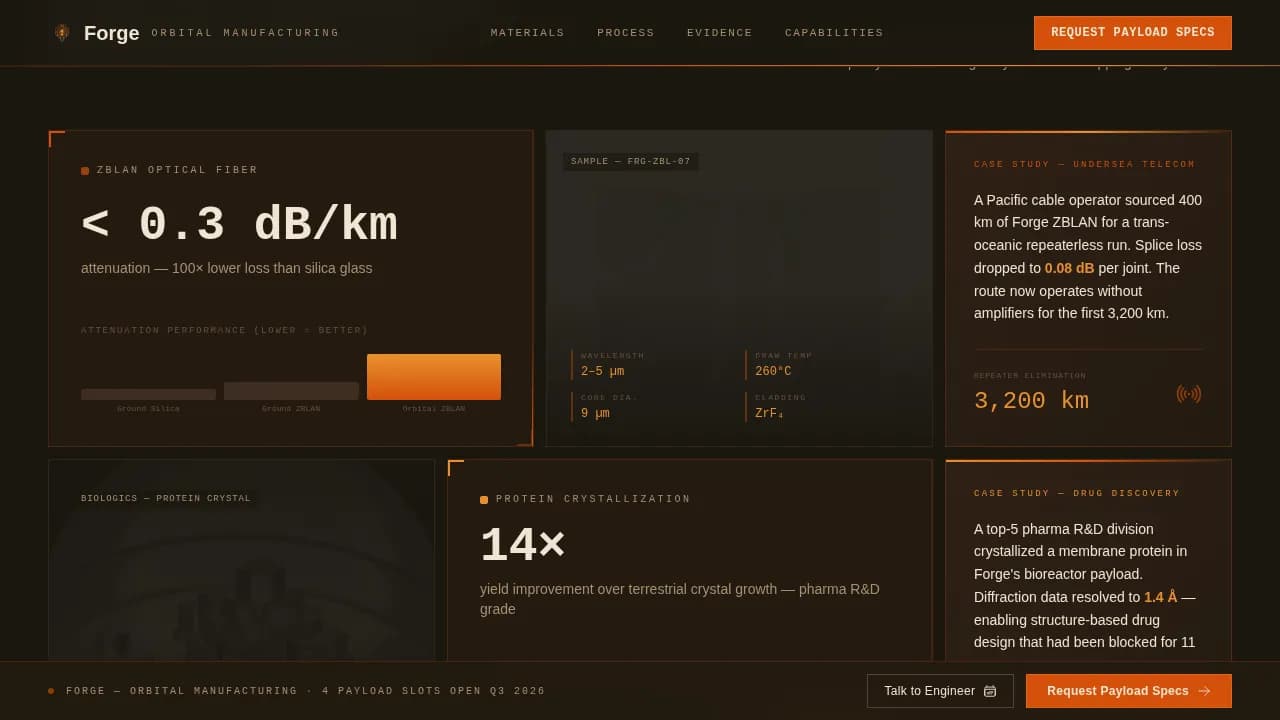 Forge is a modular card grid landing page template built for orbital microgravity manufacturing services. It leads with performance data, guides procurement directors and R&D leads through material proof points, and drives clicks toward a capabilities PDF or an engineer meeting. The Engineering Blueprint visual identity pairs soot-dark backgrounds with heat-glow orange accents for an unmistakably industrial space aesthetic.