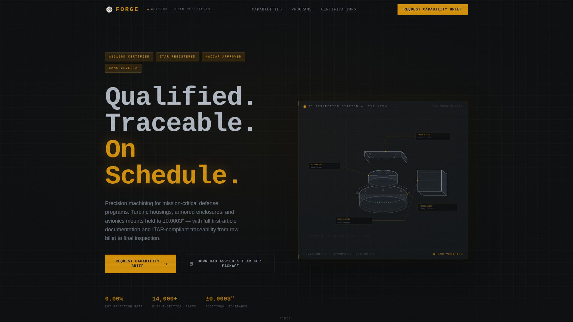Forge is a single-column landing page template built for precision defense manufacturers and defense OEM suppliers. It uses a Data Command visual theme, a Carbon Fiber color system, and a Case Study Narrative structure to present qualifications, traceability records, and program outcomes to defense program managers, procurement officers, and engineering leads evaluating new suppliers.