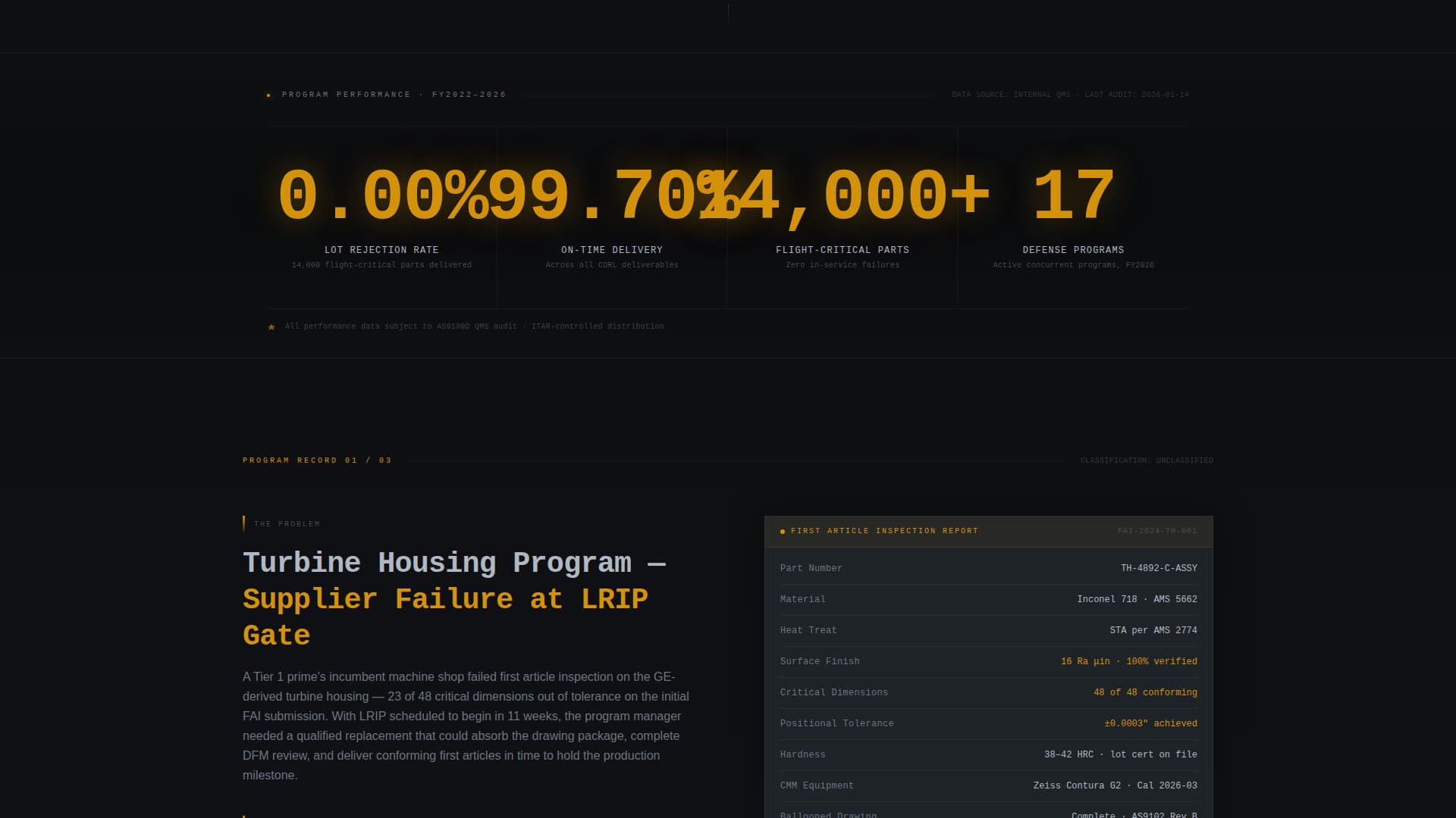 Each scroll section tells a complete program story. It opens with the problem, walks through the process including design for manufacturability review and first article inspection data, and closes with hard outcome numbers: units delivered, lot rejection rate, and schedule performance. Case studies escalate in complexity and classification level as the visitor scrolls.
