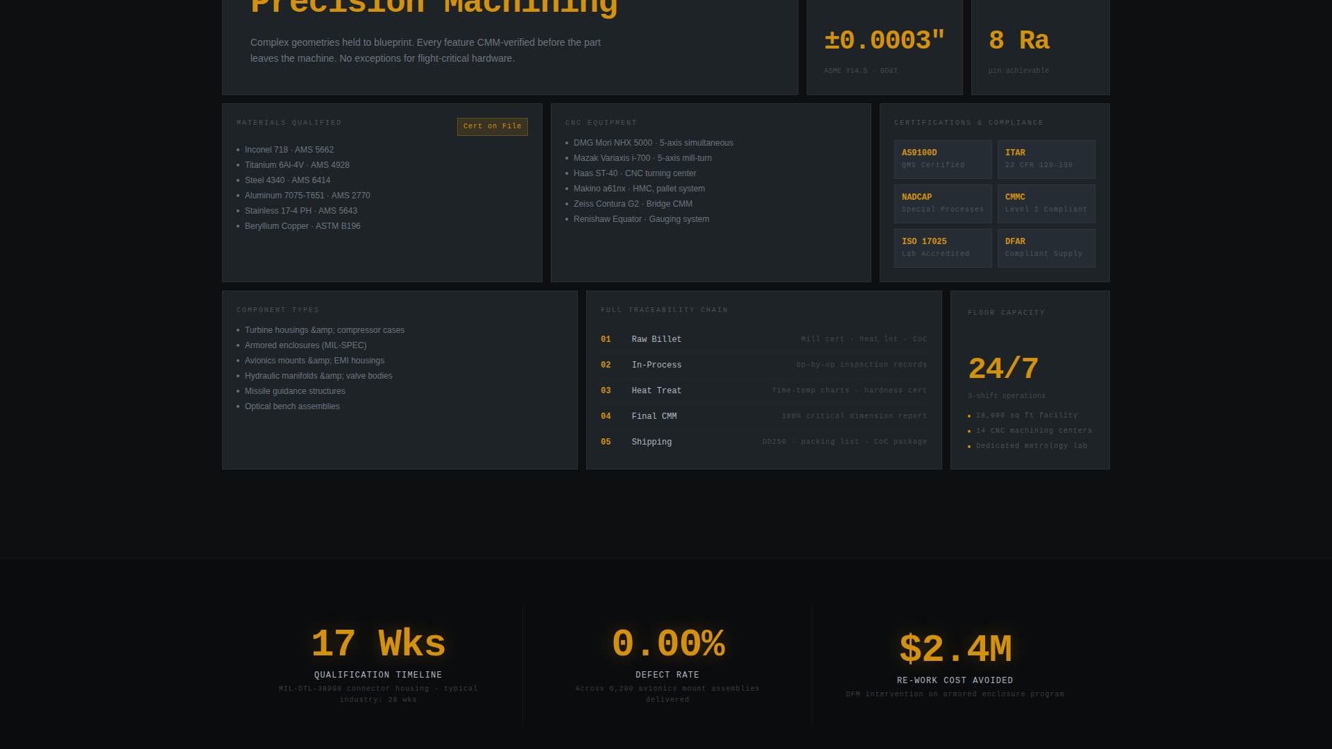 Between case study sections, full-width interstitial blocks display a single data point in signal amber on carbon black. These statements function like instrument readings, giving the scroll a rhythm that mirrors how program managers actually evaluate suppliers: story, proof, story, proof.