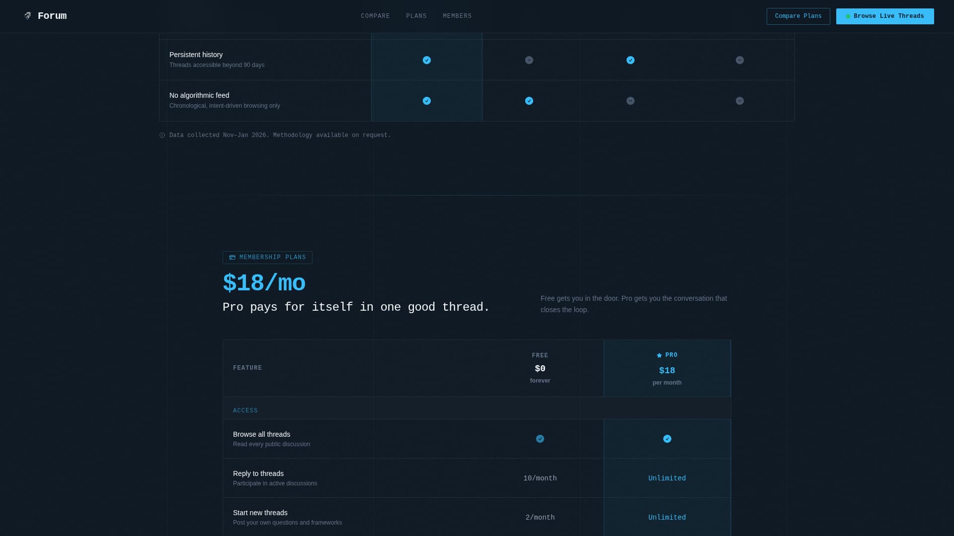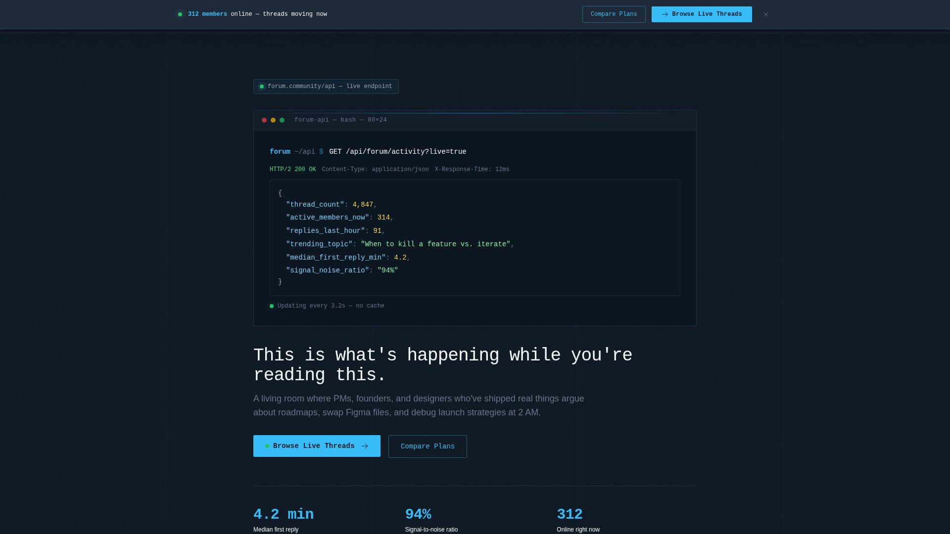 Forum is a single-page landing page template designed for professional product communities. It leads with a live-data code snippet in the header, builds trust through two dense comparison tables, and ends with a focused click-through to thread browsing. The layout is terminal-functional, data-forward, and built for product people who want proof before sign-up.