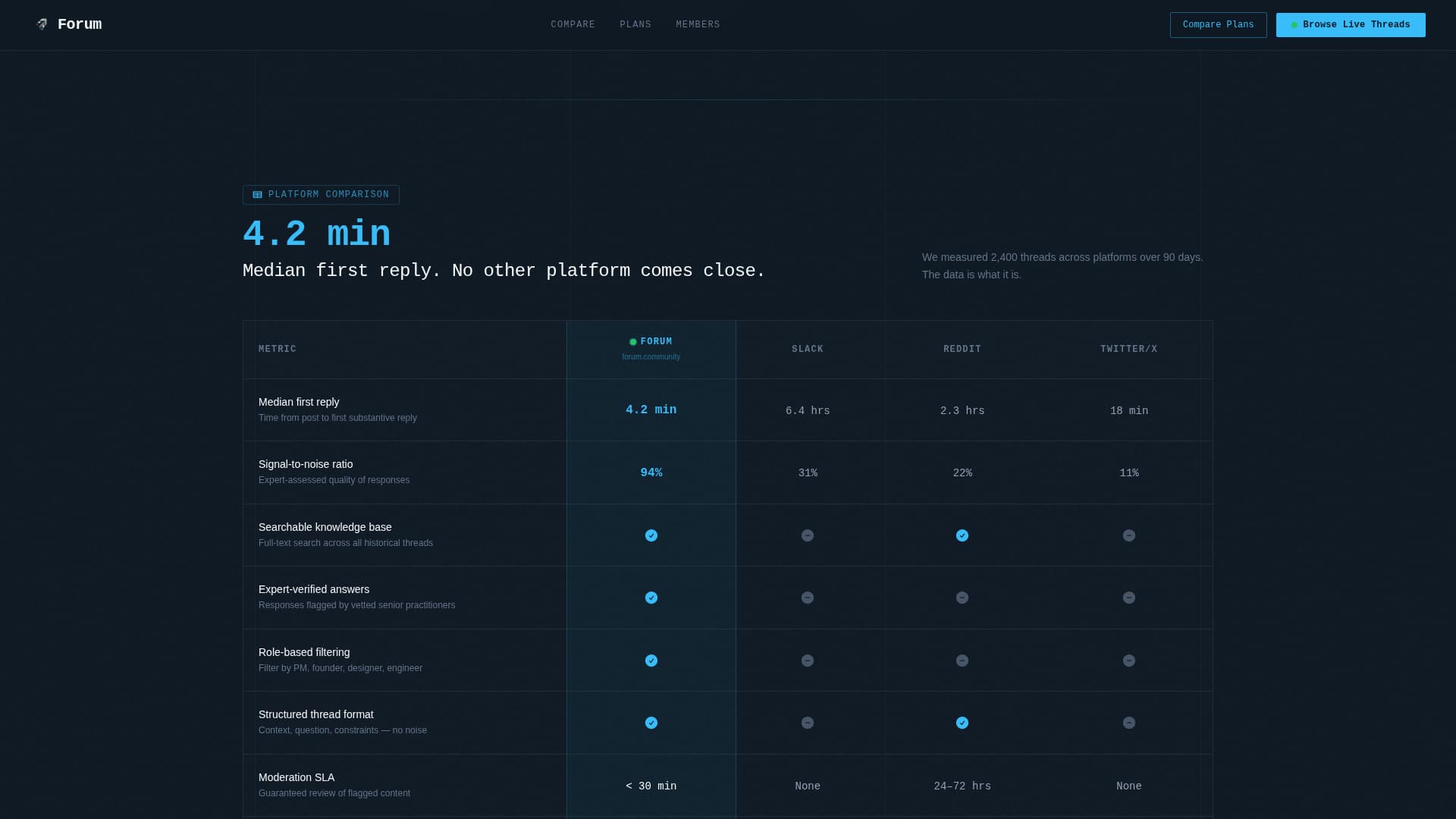The first comparison table benchmarks the forum against Slack communities, Reddit, and Twitter/X. Columns cover average reply time, signal-to-noise ratio, searchable knowledge base availability, and expert-verified answers. Numbers are displayed in 32-pixel sky blue to pull the eye immediately.
