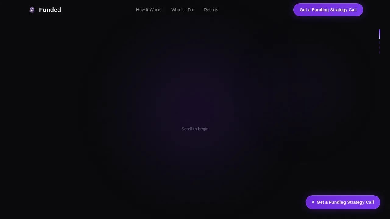 After the scroll-jacked hero resolves, a fixed "Get a Funding Strategy Call" button appears with a violet-glow pulse. It reappears anchored at the bottom of each layered card throughout the page. This persistent placement ensures that visitors who are ready to act can do so at any point without scrolling back to the top.