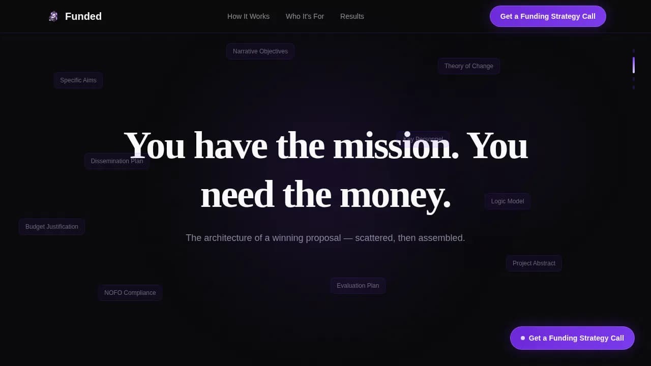The hero locks the viewport and types a single sentence in spectral white: "You have the mission. You need the money." Each scroll tick peels back a frosted-glass layer. Grant proposal fragments including specific aims, theory of change, and budget justification drift in parallax before snapping magnetically into a complete, glowing proposal document. The sequence covers four full scroll-lengths and ends with an awarded stamp fading in.