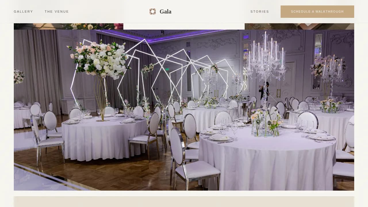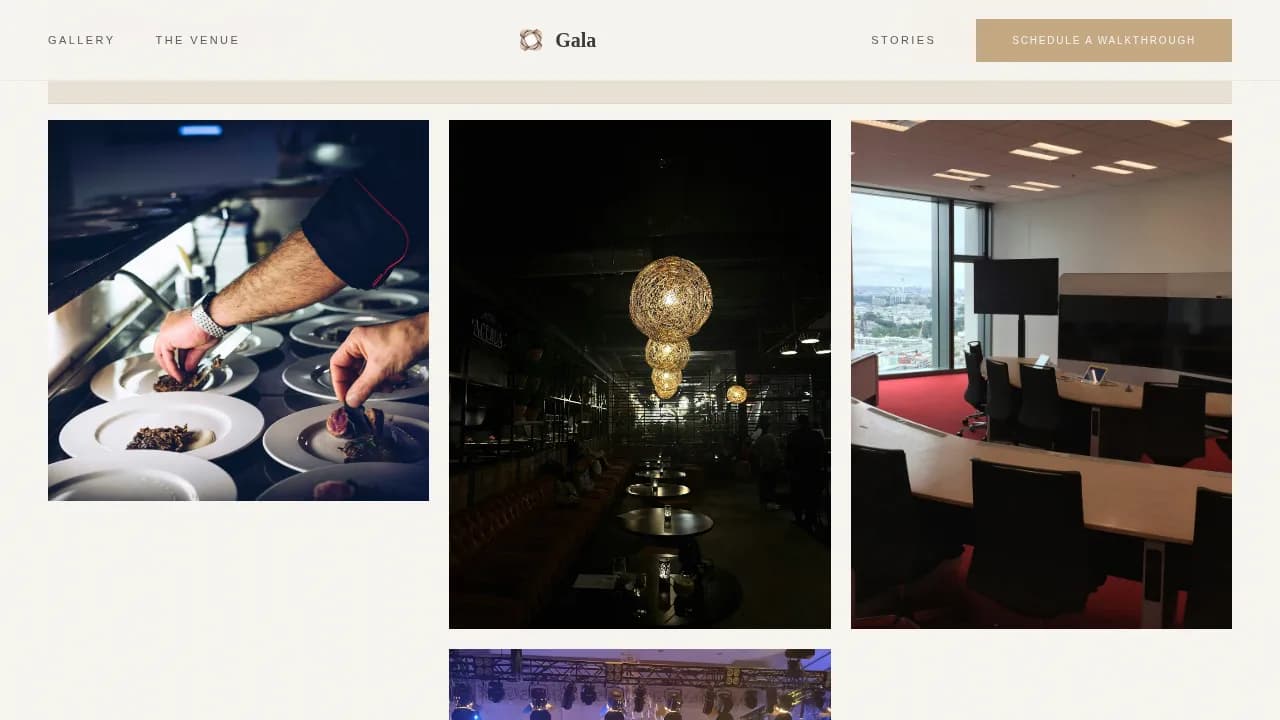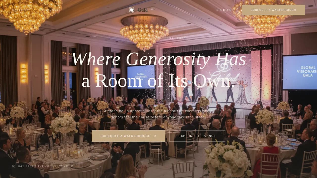 Gala is a single-page event landing page designed for charity gala venues targeting nonprofit fundraising clients. It combines a full-bleed hero photo, a masonry Gallery Walk grid, a scroll-reveal philosophy statement, venue details, testimonials, and a booking form into one cohesive, emotionally resonant landing experience built to turn page visitors into walkthrough bookings.