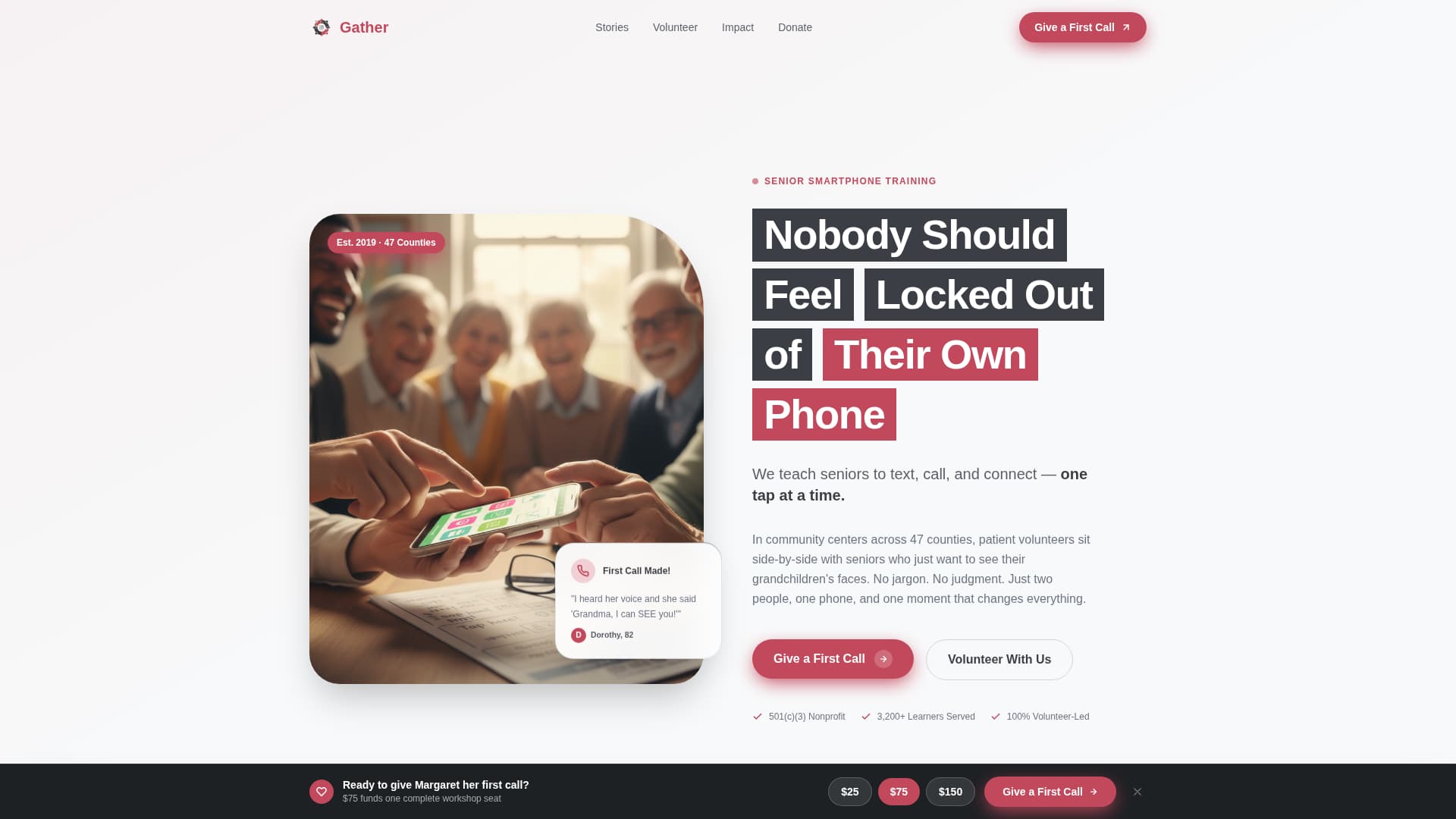 Gather is a warm, modular card-grid landing page built for senior smartphone training nonprofits. It pairs a split photo-and-text header with scrolling rows of learner stories, volunteer profiles, and animated impact metrics. A sticky donation bar and preset giving tiers make it easy for supporters to fund real outcomes, from printed guide kits to refurbished smartphones, one tap at a time.