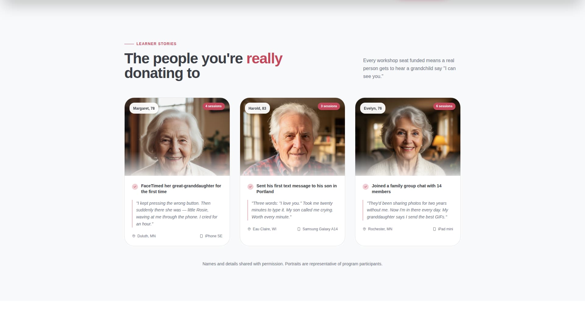 The first card row presents three learner portraits, each with the person's age and a one-sentence breakthrough moment. This format turns program outcomes into specific, memorable stories. Visitors connect with a named individual rather than an abstract beneficiary count.