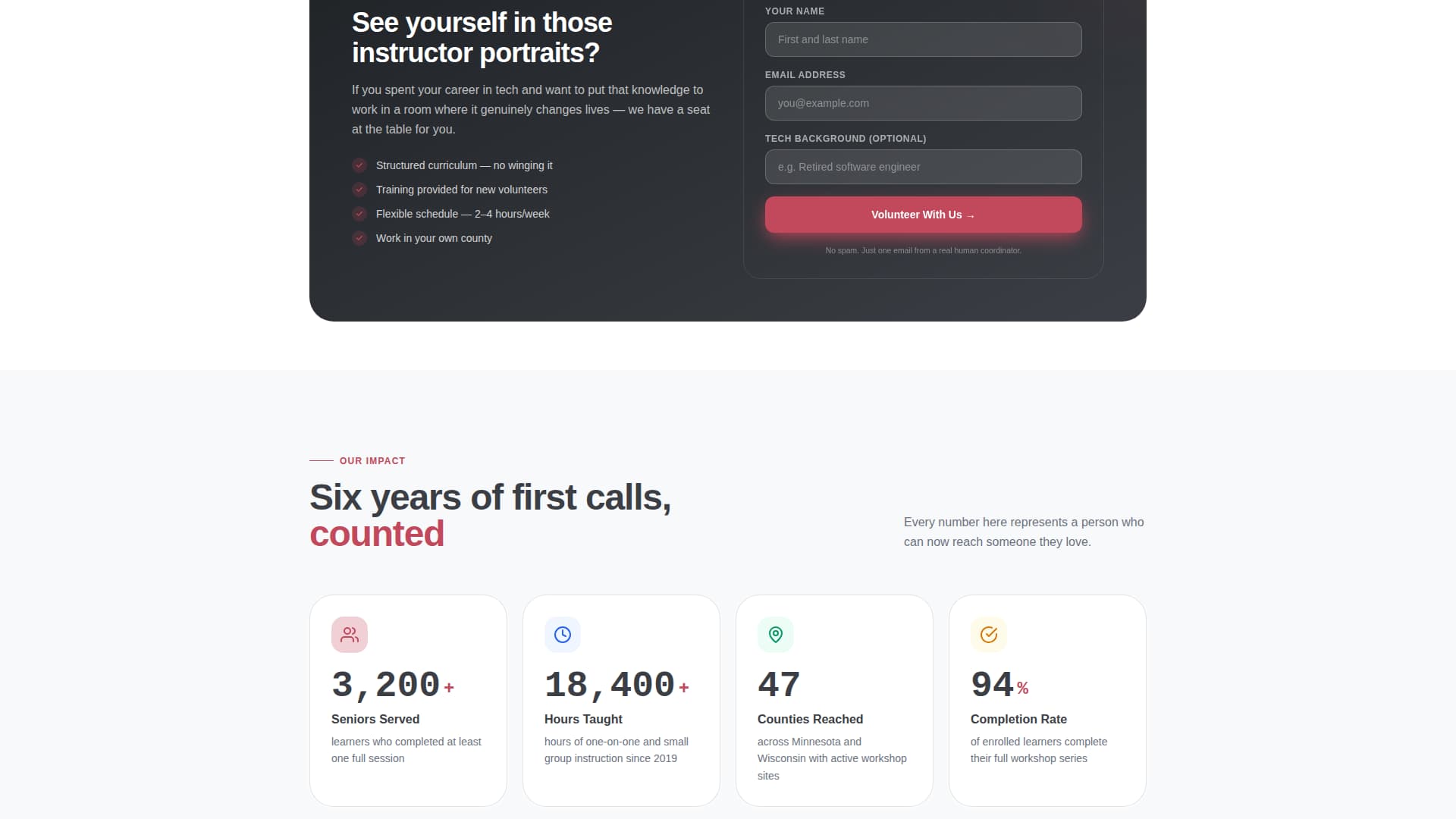 A lightweight name-and-email capture card sits between the instructor row and the impact metrics. It catches retired professionals at the precise moment they feel inspired by the instructor profiles. The placement is deliberate and converts interest into a concrete next step.