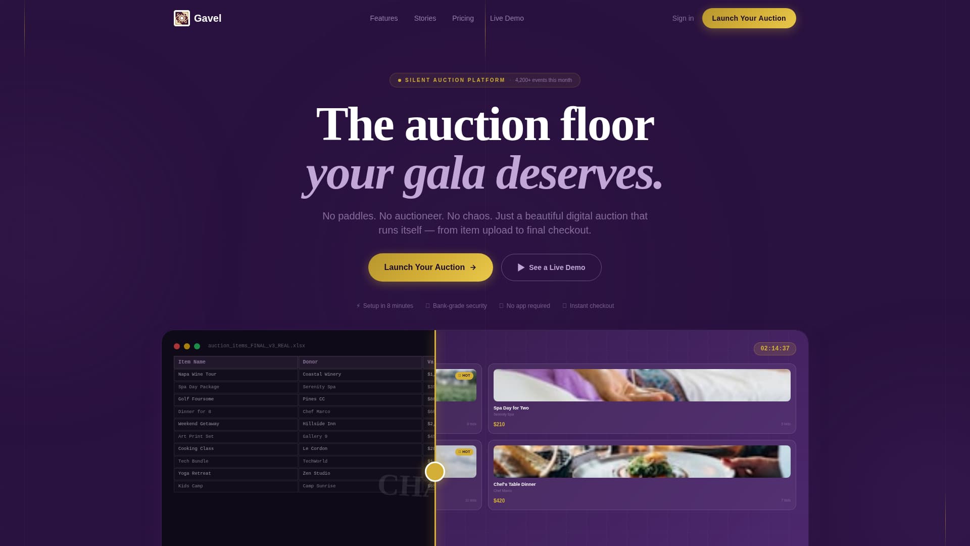 The header opens with an interactive slider. The left panel shows a chaotic spreadsheet of handwritten bid amounts and crumpled paper. Dragging right reveals the same auction running live on the platform, complete with browsable item cards, real-time bid counters, donor logos, and a glowing countdown reading 02:14:37. A headline fades in over the right panel: "Your Next Auction, Already Running."