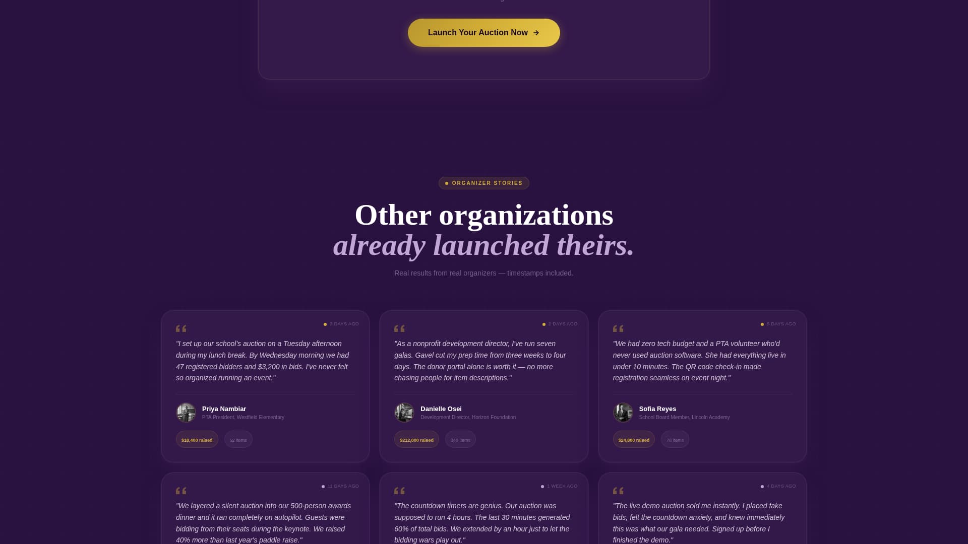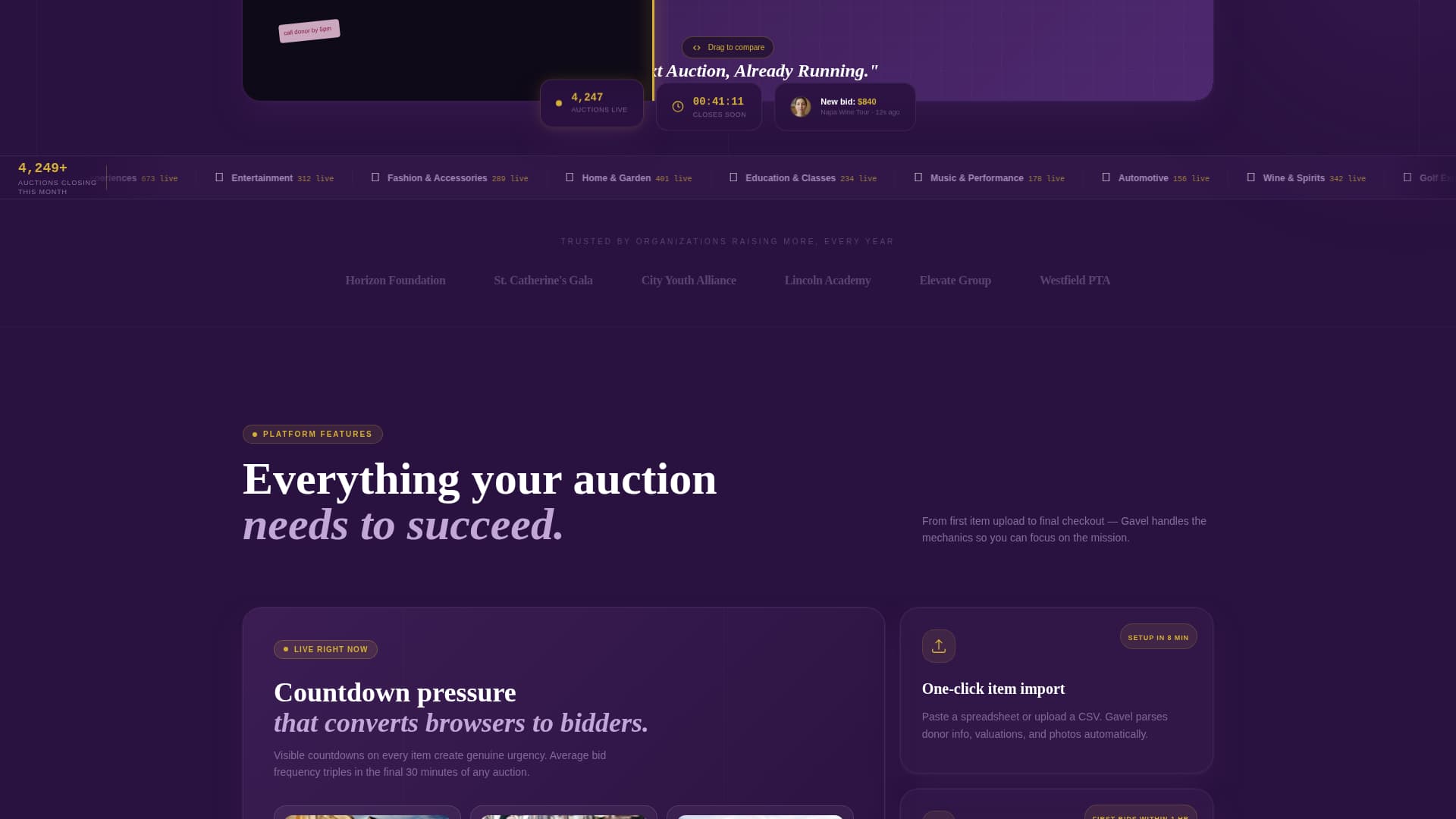 Gavel is an elegant silent auction landing page template designed for nonprofit fundraisers, school events, and corporate galas. It opens with a dramatic Before/After Slider, layers countdown urgency through every scroll depth, and drives conversions through a champagne-gold "Launch Your Auction" button and an inline three-step setup flow.