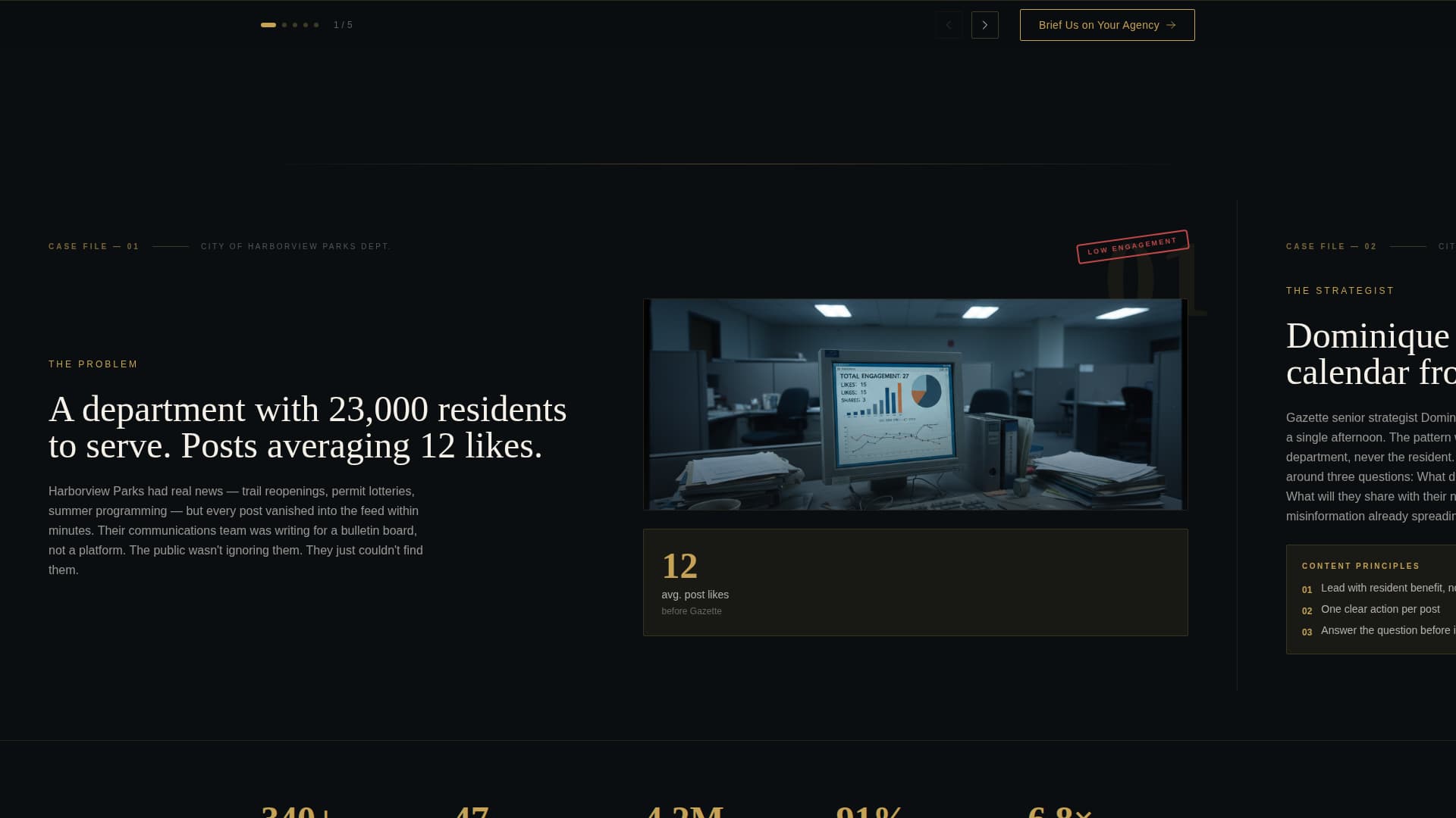 Each lateral panel functions as a classified case file. The first panel presents a client's original problem. The second reveals the strategist's process and content calendar. The third shows the transformed result. The sequence escalates in stakes across multiple government clients, giving the narrative momentum and credibility.