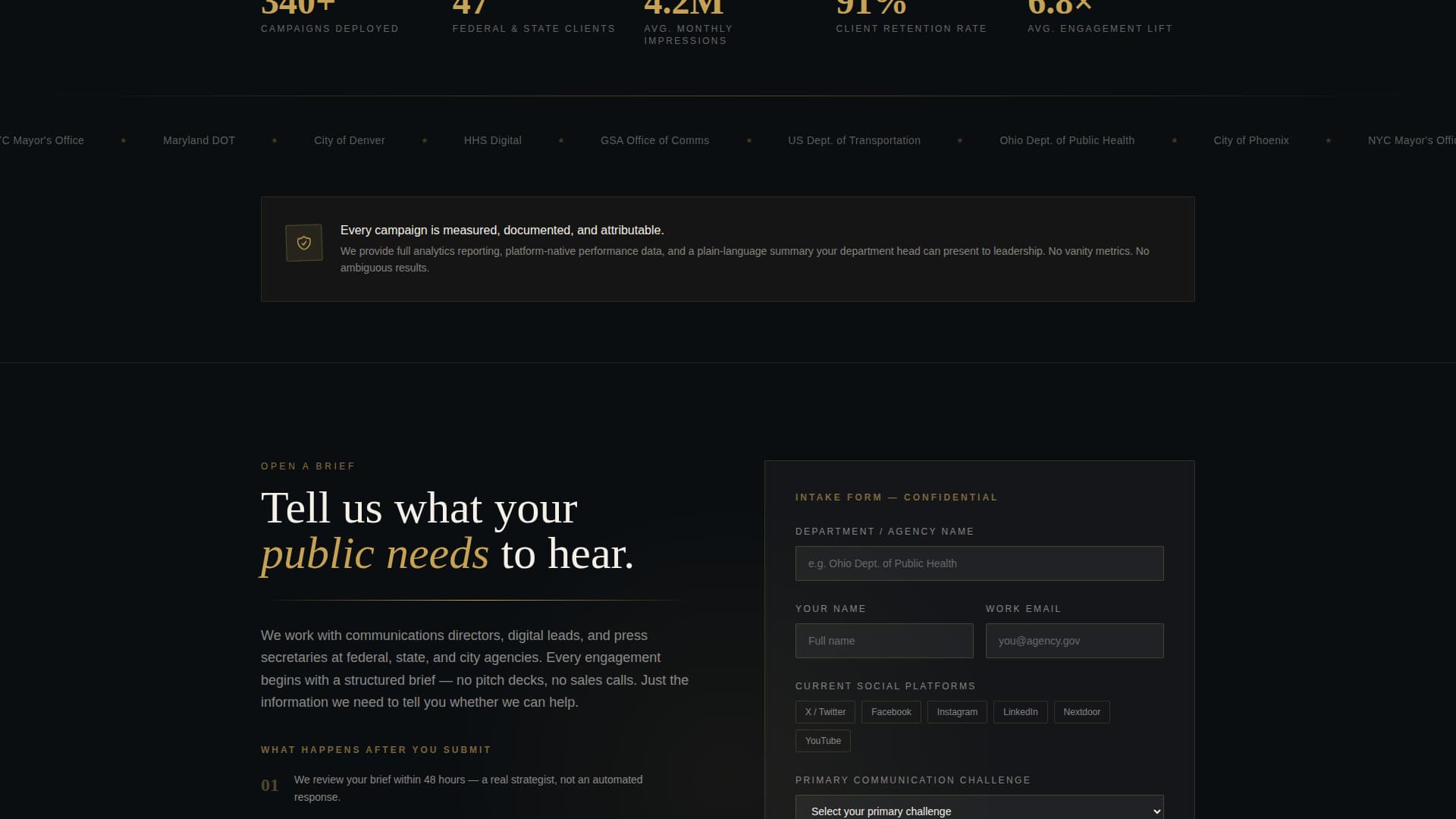 Most agency portfolio pages feel interchangeable. Government clients need more than a generic showcase. They need to see that an agency understands the specific pressure of public trust, regulatory tone, and algorithmic noise.