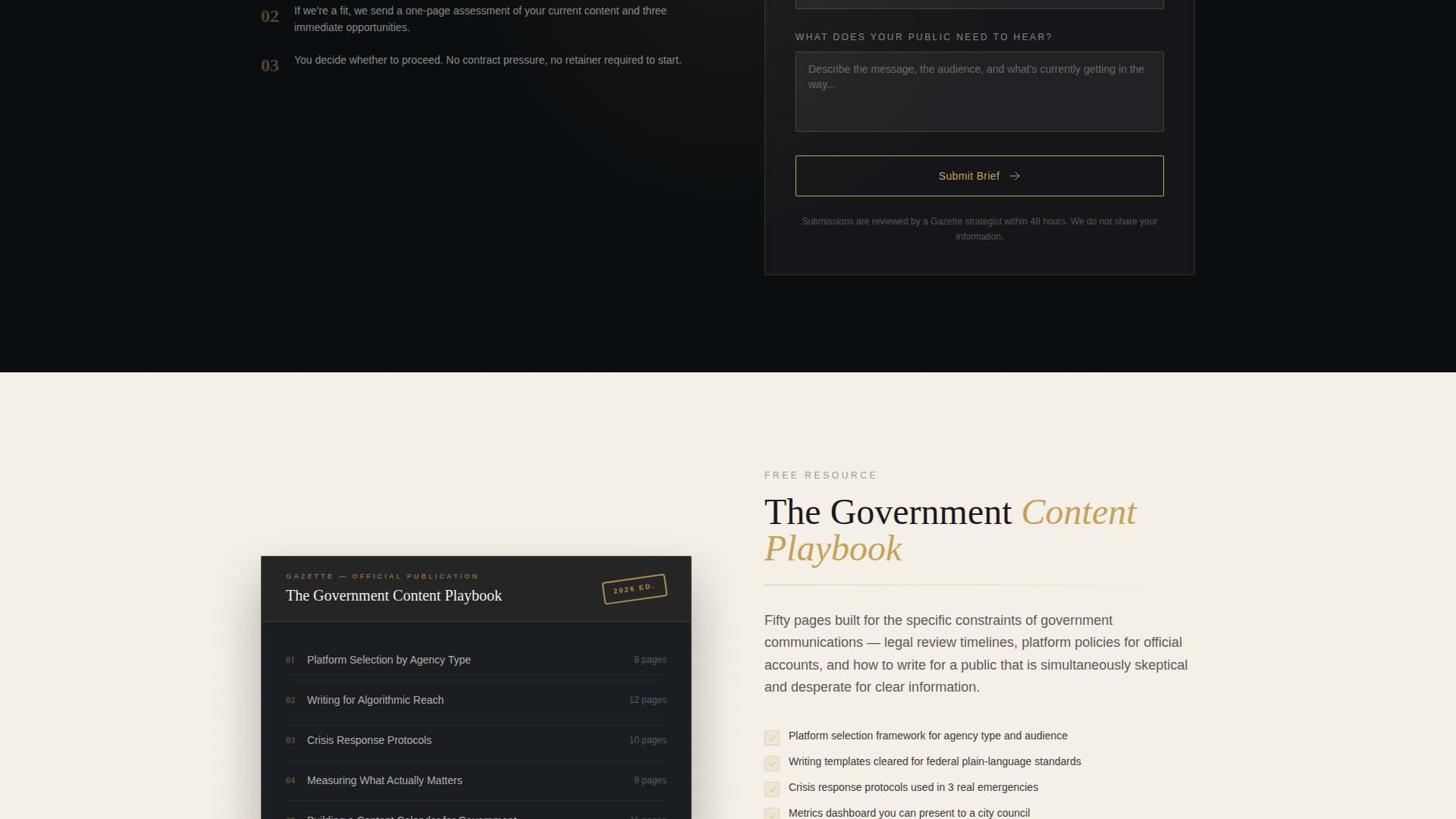 A secondary conversion path offers a downloadable PDF titled "The Government Content Playbook." Access is gated behind a.gov email field, which filters leads by institutional affiliation before the first outreach. This gives the agency a qualified second touchpoint with prospects who are not yet ready to submit a full brief.