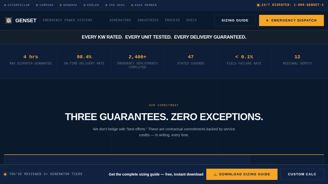 The Genset landing page template is built for emergency generator suppliers who need to convert facility managers, procurement officers, and contractors into qualified leads. It leads with a guarantee framework, anchors trust through a detailed comparison table, and drives downloads of a sizing guide. The layout is desktop-first, industrially precise, and structured to move fast-moving buyers from urgency to decision.