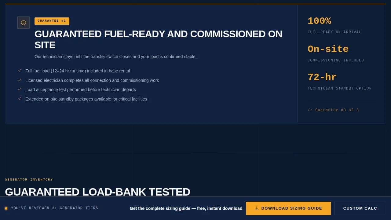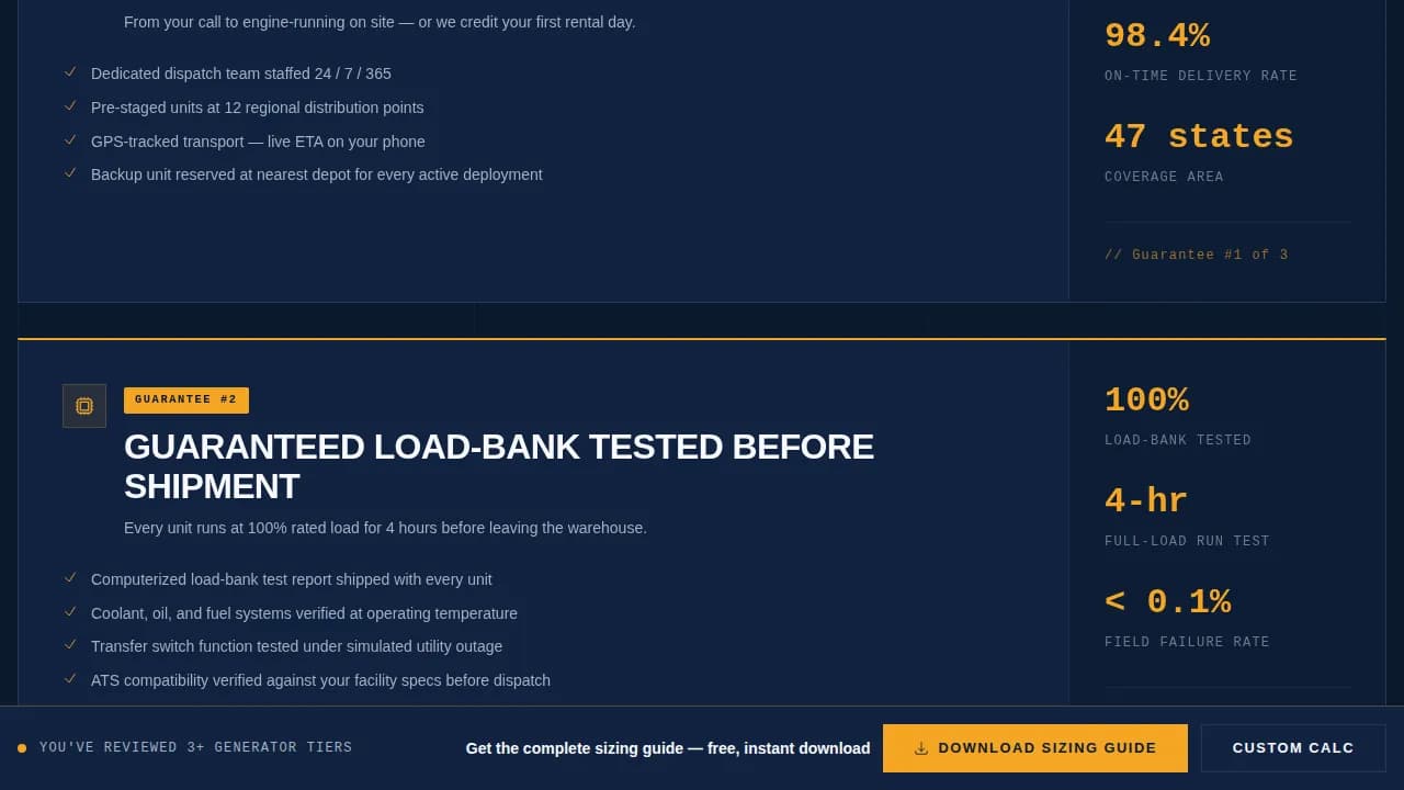 This is a guarantee-led, single-page landing page template for emergency generator suppliers. It opens with institutional credibility, delivers a structured comparison table stacked by kilowatt rating, and gates a sizing guide download behind a short qualification form. Every section builds certainty from the first scroll to the final call to action.
