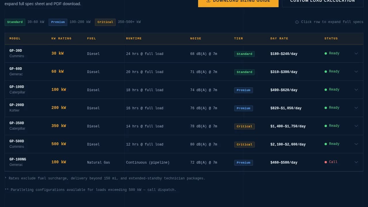 Units are organized by kilowatt rating, fuel type, runtime, noise level, and price tier. Each table row is expandable and links to a full specification document, giving procurement officers the detail depth they need without cluttering the main view.