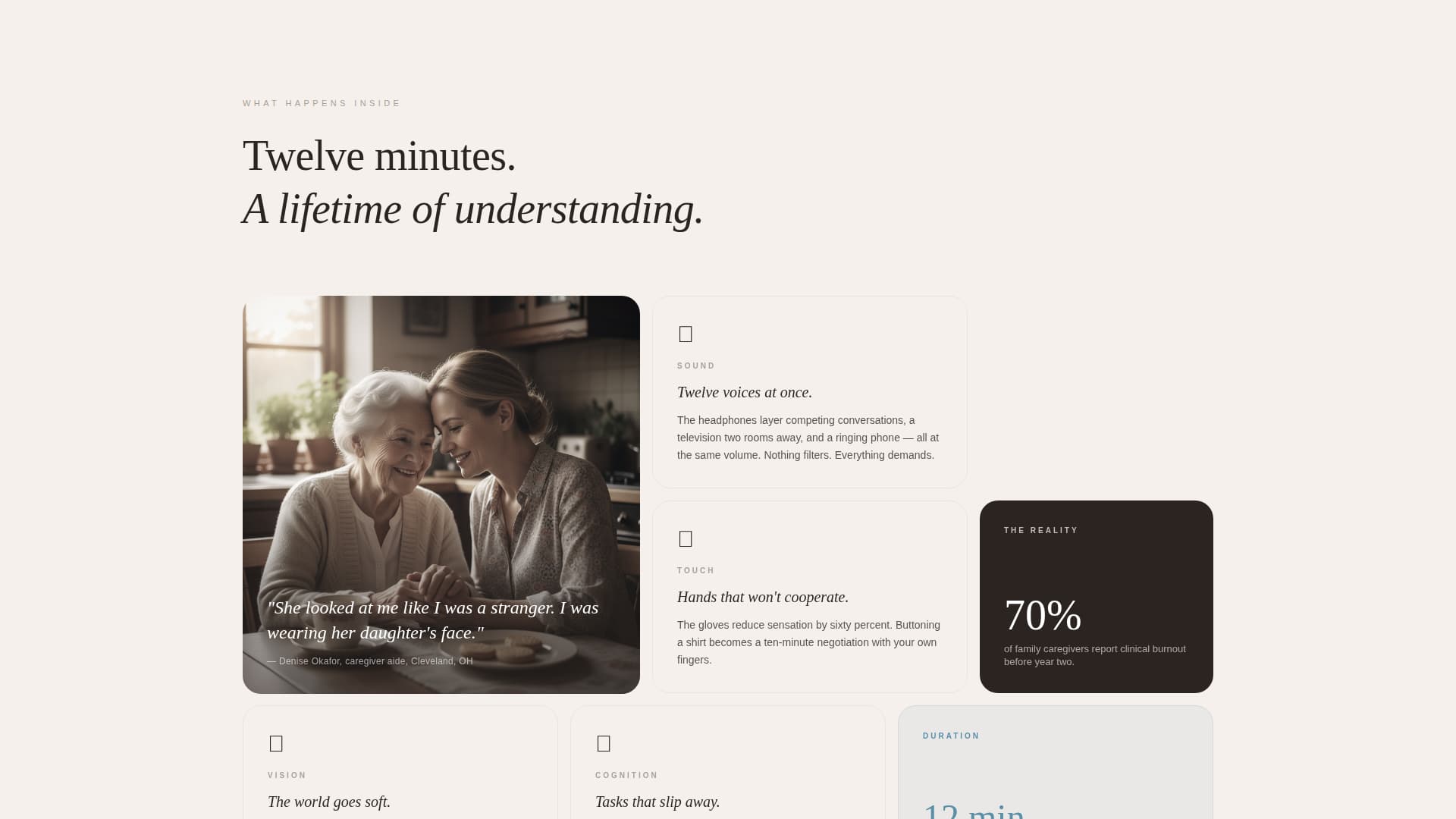 Select cards in the mosaic display high-impact data points, such as caregiver burnout rates, framed plainly and without visual noise. These facts land with weight inside the emotional flow of the page without breaking its human tone.