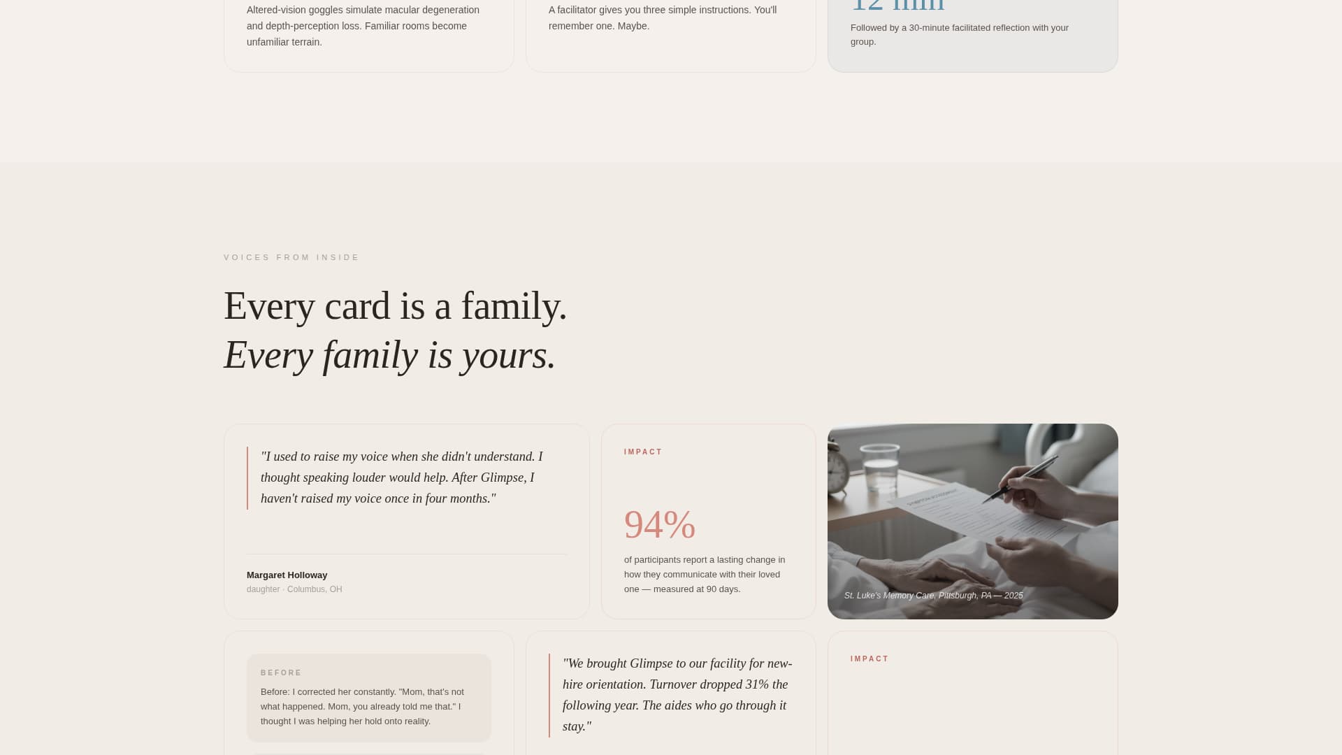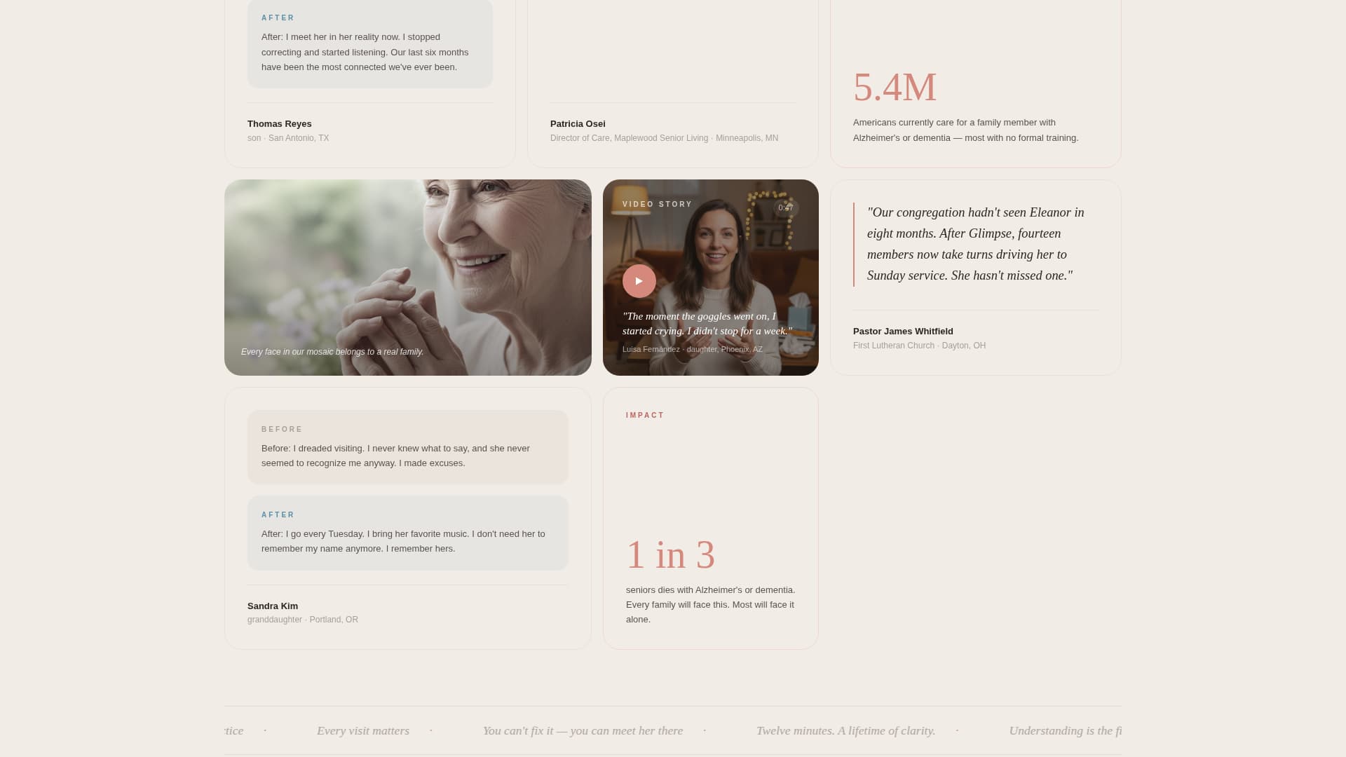 Glimpse is a donation-focused landing page template designed for organizations running virtual dementia simulations. It opens with a quiet manifesto header, then builds emotional depth through a scrolling mosaic of caregiver stories, gut-punch statistics, and video clips. Every design decision serves one purpose: helping visitors feel enough to give.