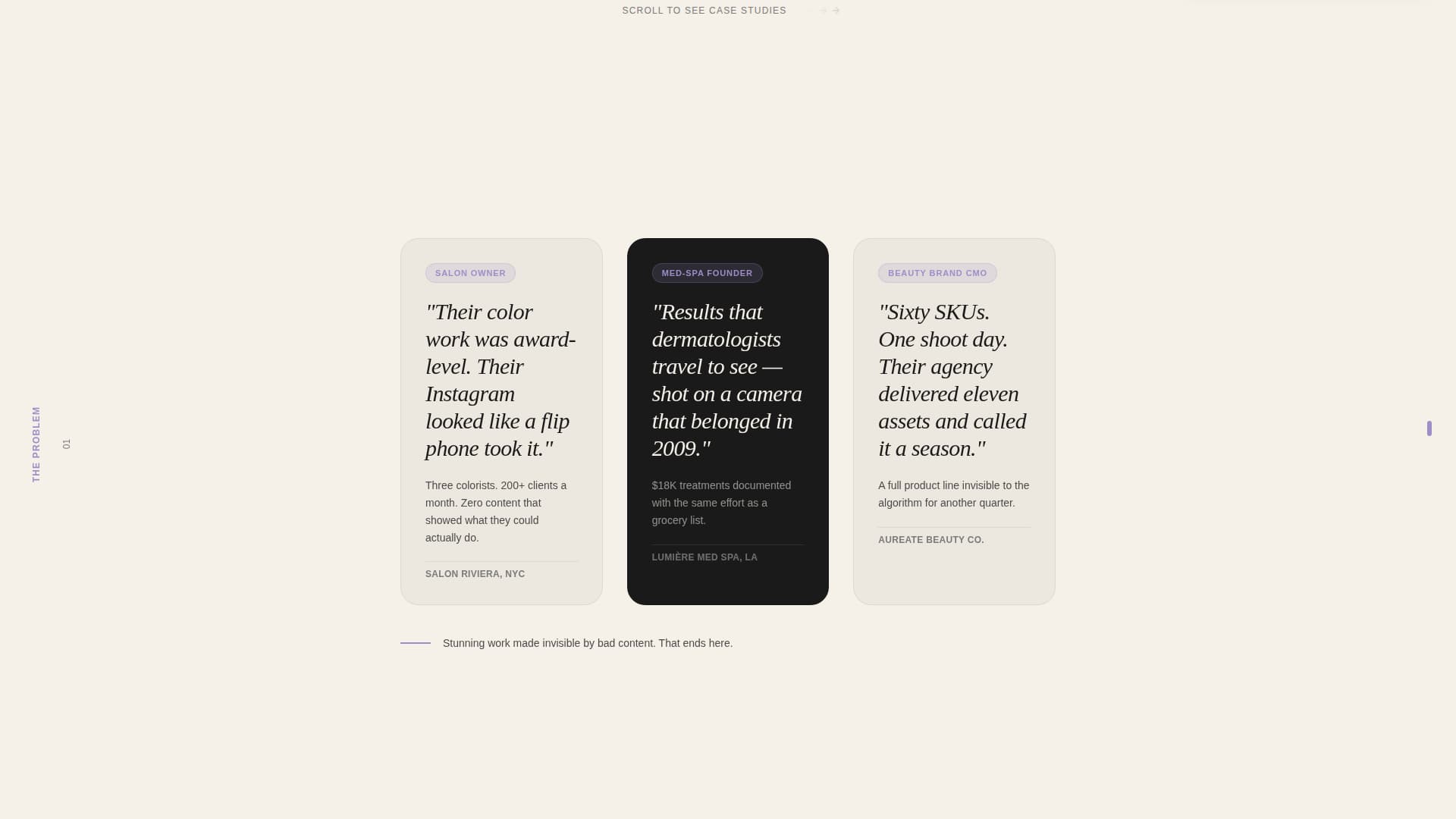 Gloss is a horizontal scroll landing page designed for agencies that produce cinematic content for salons, med-spas, and beauty brands. The layout moves visitors through escalating proof panels, from client problem to measurable results to award recognition, before landing them on a full-width booking call-to-action. The design feels like a polished editorial lookbook brought to life on screen.