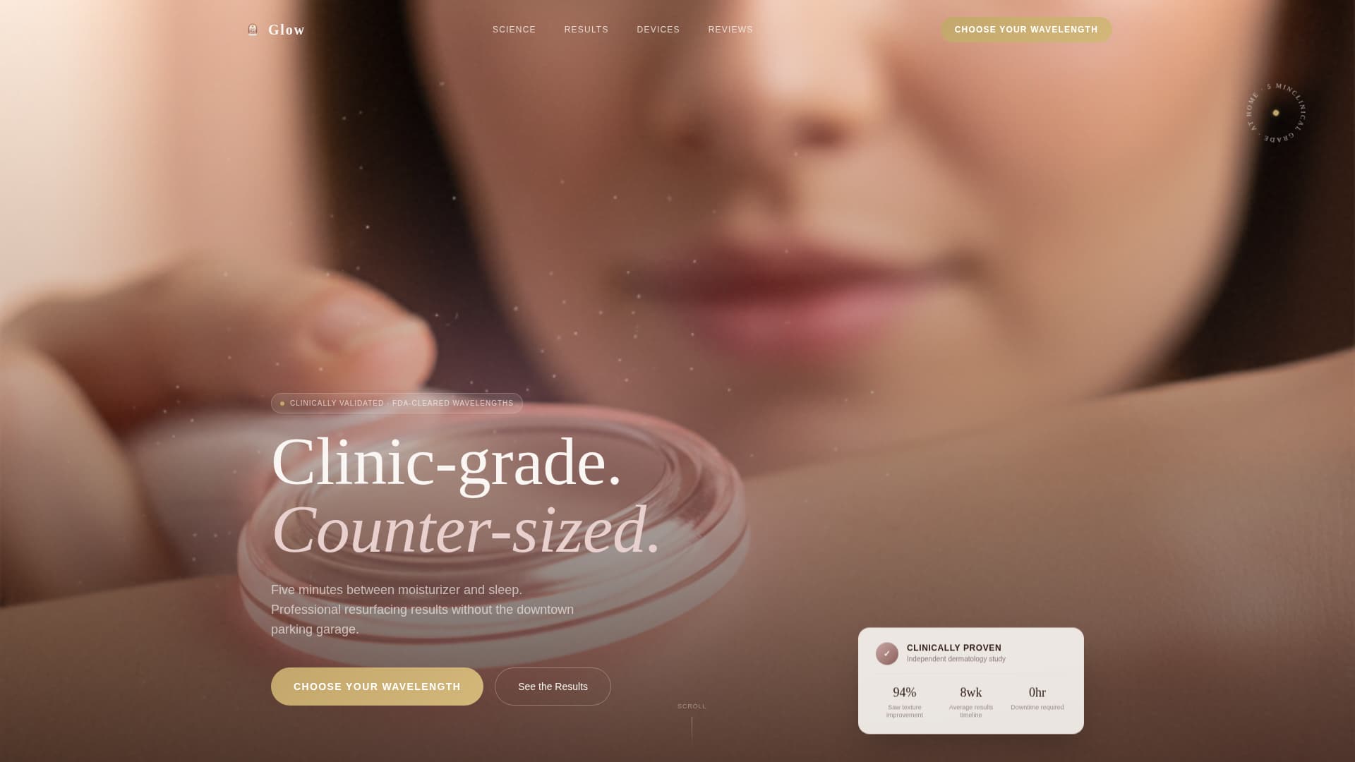The header opens with an edge-to-edge macro shot of the device's treatment window pressed against bare skin, light pulsing through rose-gold housing. No headline appears for the first beat, letting the image establish trust. A single drift-in headline then reads: "Clinic-grade. Counter-sized."