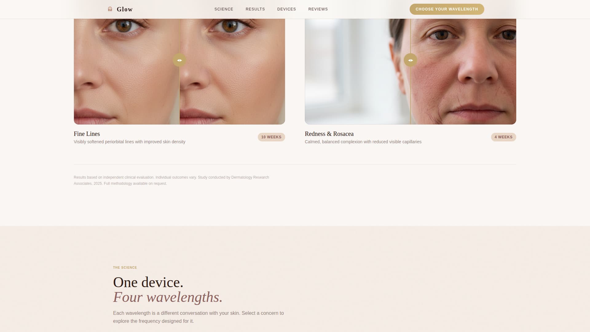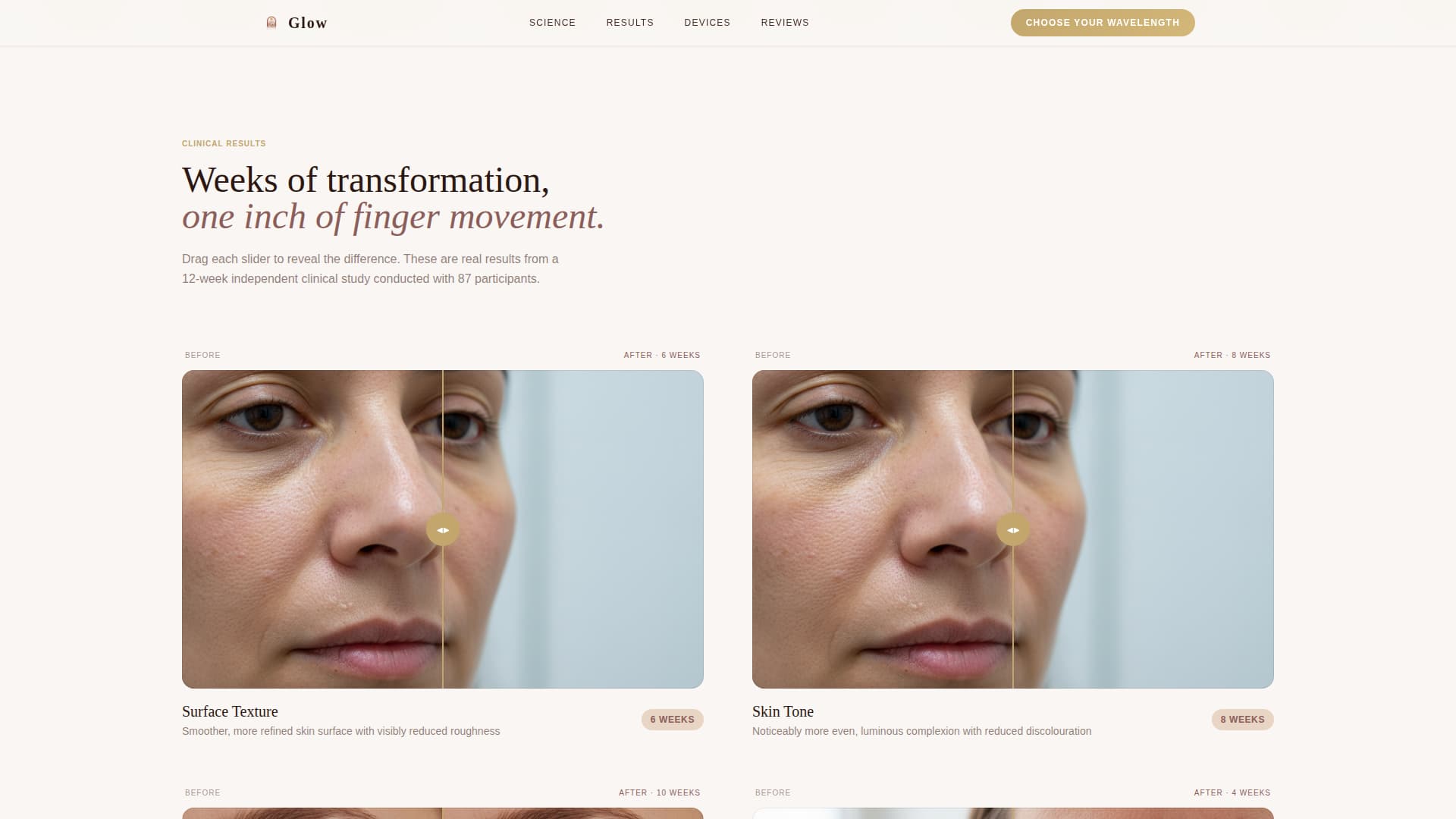 Glow is a gallery-and-detail landing page built for a premium at-home laser skin device. It blends cinematic before-and-after photography with a three-tier product comparison layout, a wavelength detail gallery, and a built-in Skin Quiz lead capture flow. The result is a page that earns trust fast and guides every visitor toward the right device tier.