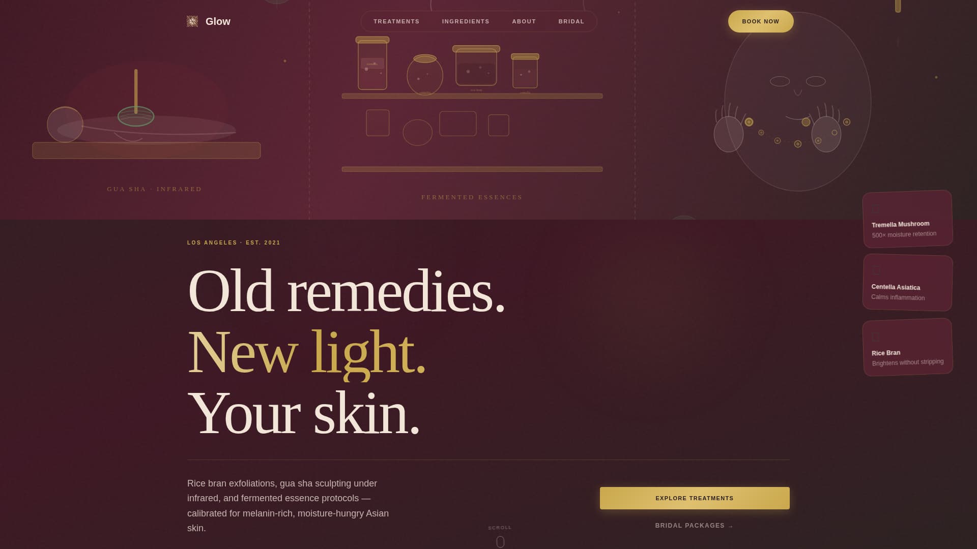 Glow is a Neo-Retro Asian skincare clinic landing page built for direct bookings. It combines a hand-illustrated panoramic header, a Pinterest-style masonry gallery of treatment cards, and a sticky package-bundling bar. Designed for Korean and Filipino women in their late twenties and brides seeking glass skin, every scroll section earns trust before asking for the booking tap.