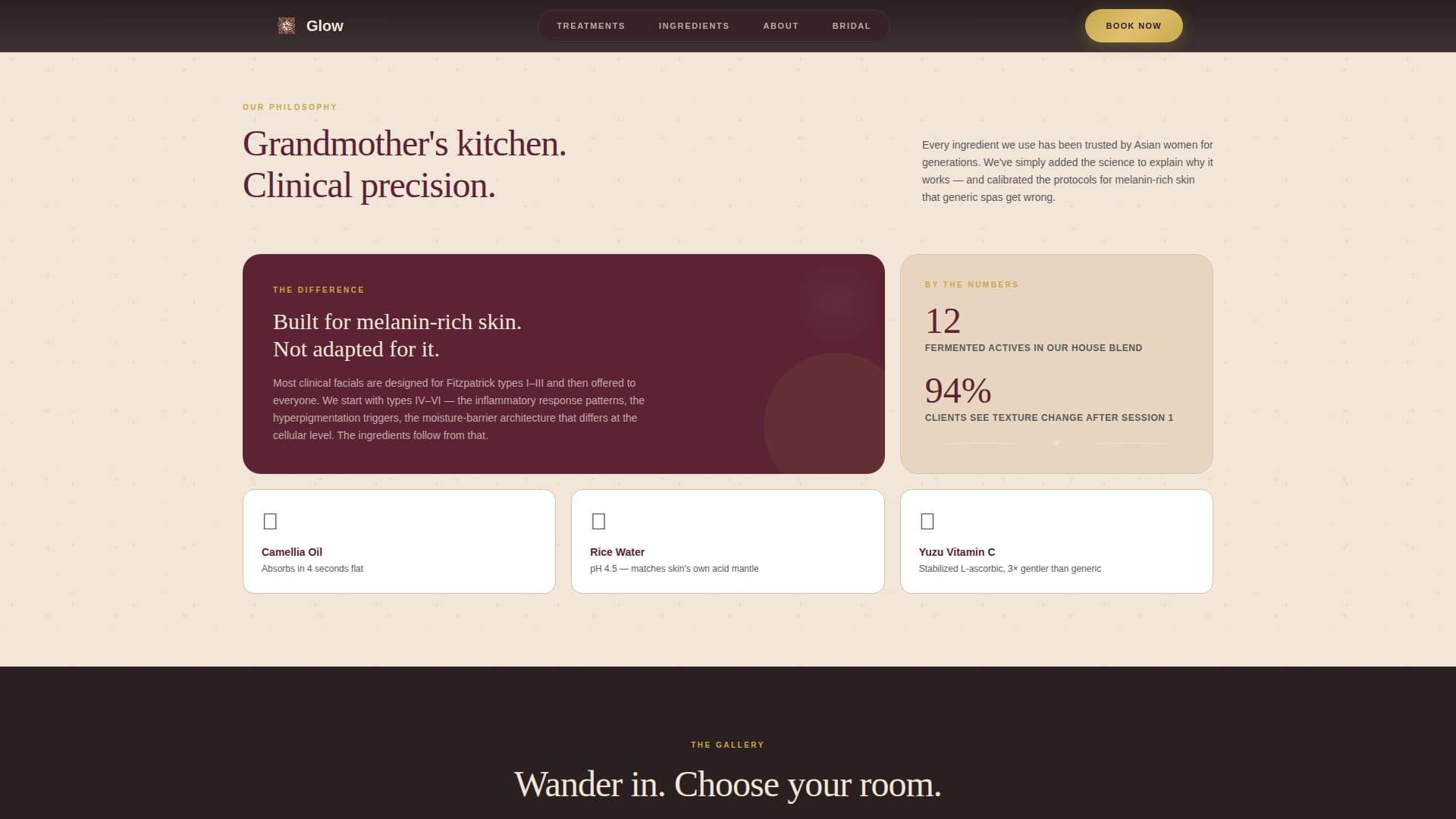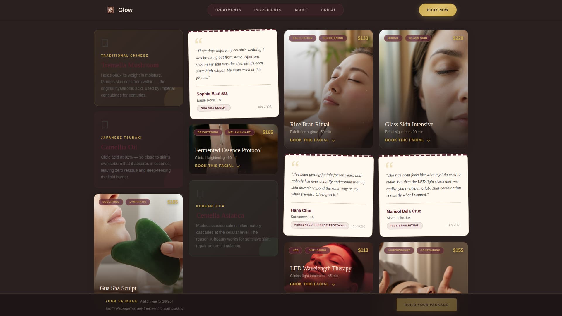 Glow is a single-page booking experience for an Asian facial treatment clinic. It opens with a custom ink-wash illustration, flows through a masonry gallery of expandable treatment cards, and closes with a bridal bundle section and live discount calculator. The design language is Neo-Retro, blending 1960s Hong Kong apothecary warmth with soft neon and terrazzo textures.