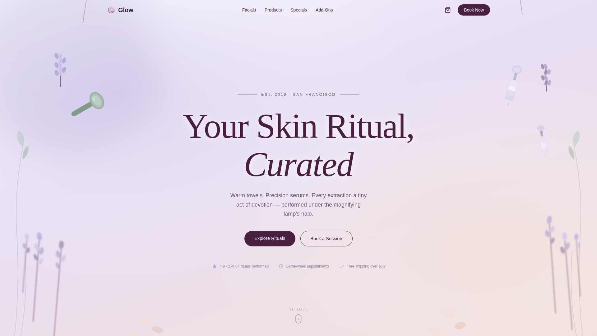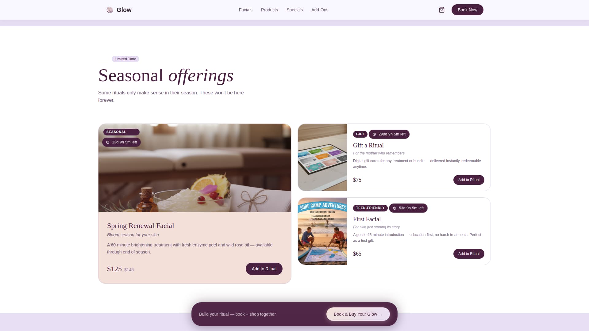 Glow is a modular card-grid landing page for facial and skincare studios. It combines a botanical illustration header, an asymmetric gallery-walk grid, and per-card purchasing so visitors can browse treatments, add products to a cart, and book an appointment without leaving the page. The design uses a soft Lavender Dream palette with deep plum call-to-action buttons.
