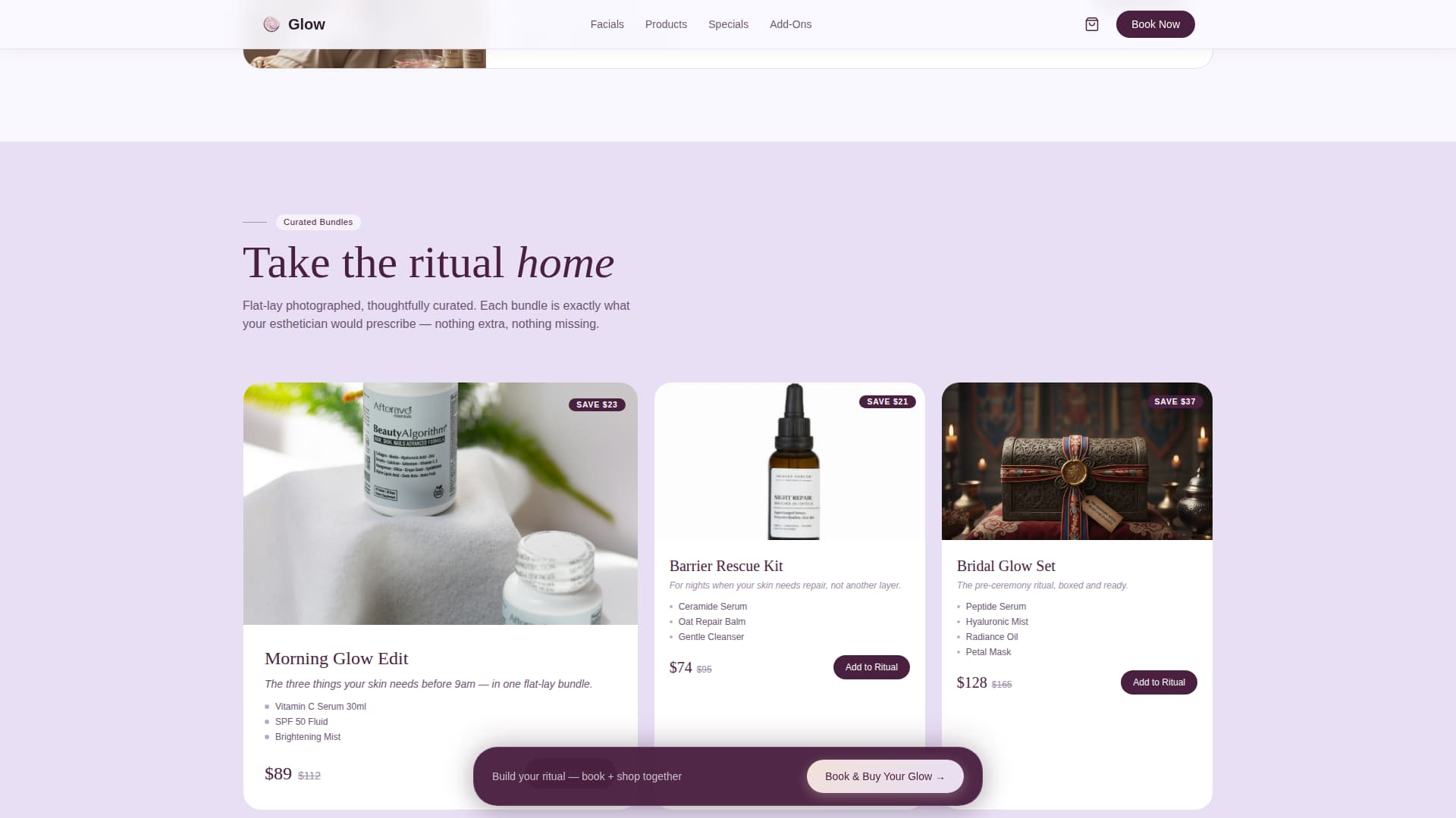 Most skincare studio pages force visitors to choose between shopping and booking. That split journey creates friction and lost revenue. Glow removes that choice entirely by putting purchasing and appointment scheduling inside the same grid-and-checkout flow.