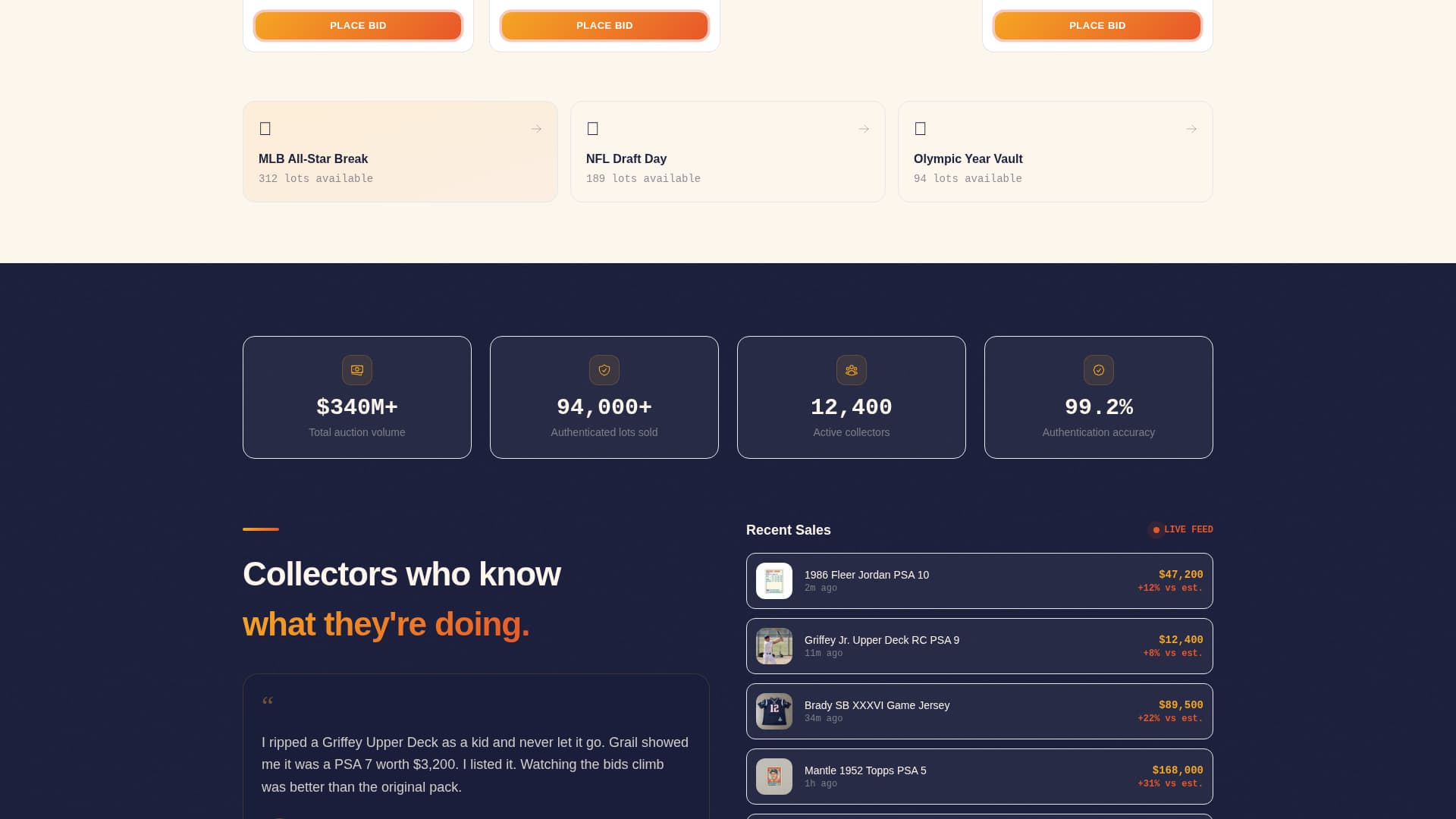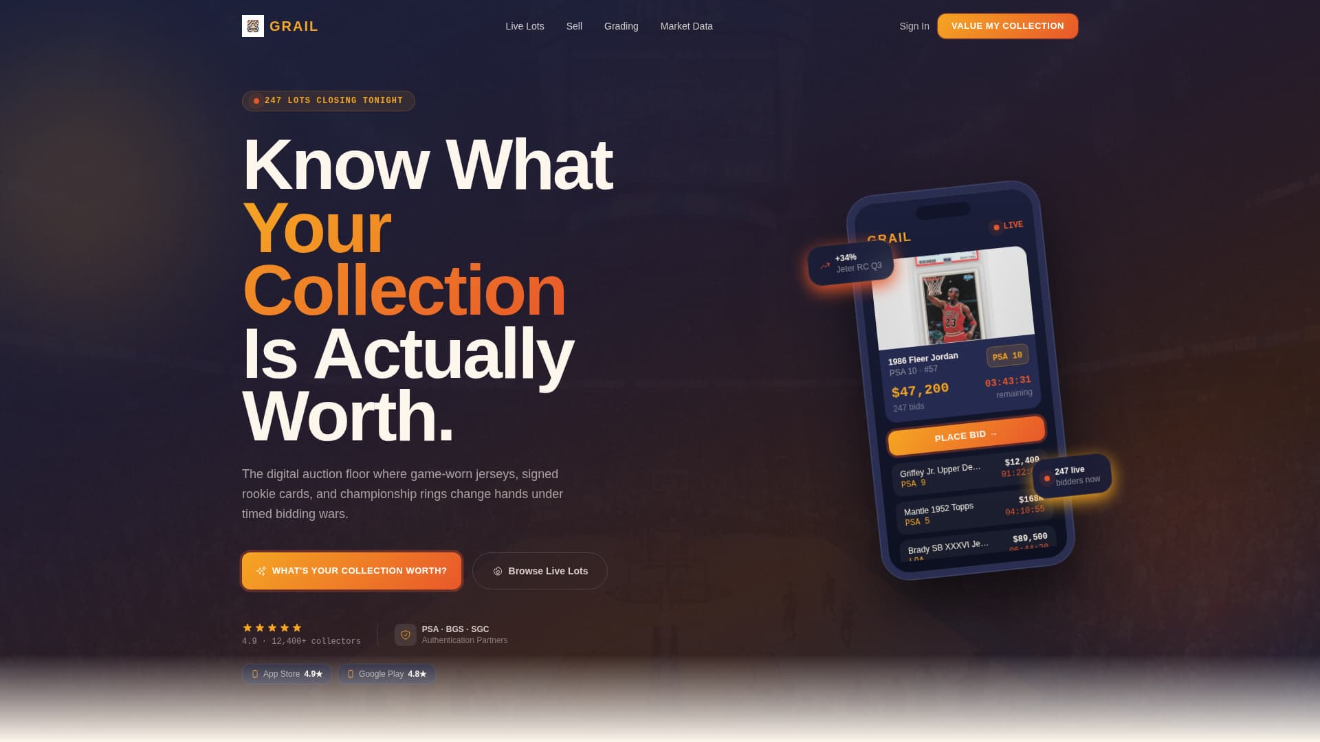 Grail is a single-page auction landing page for sports memorabilia platforms. It opens with a floating phone mockup showing a live bid in progress, moves into a season-synced masonry lot grid, and closes visitors into action through a five-step collection valuation quiz. Every visual element reinforces urgency, provenance, and the thrill of competitive bidding.