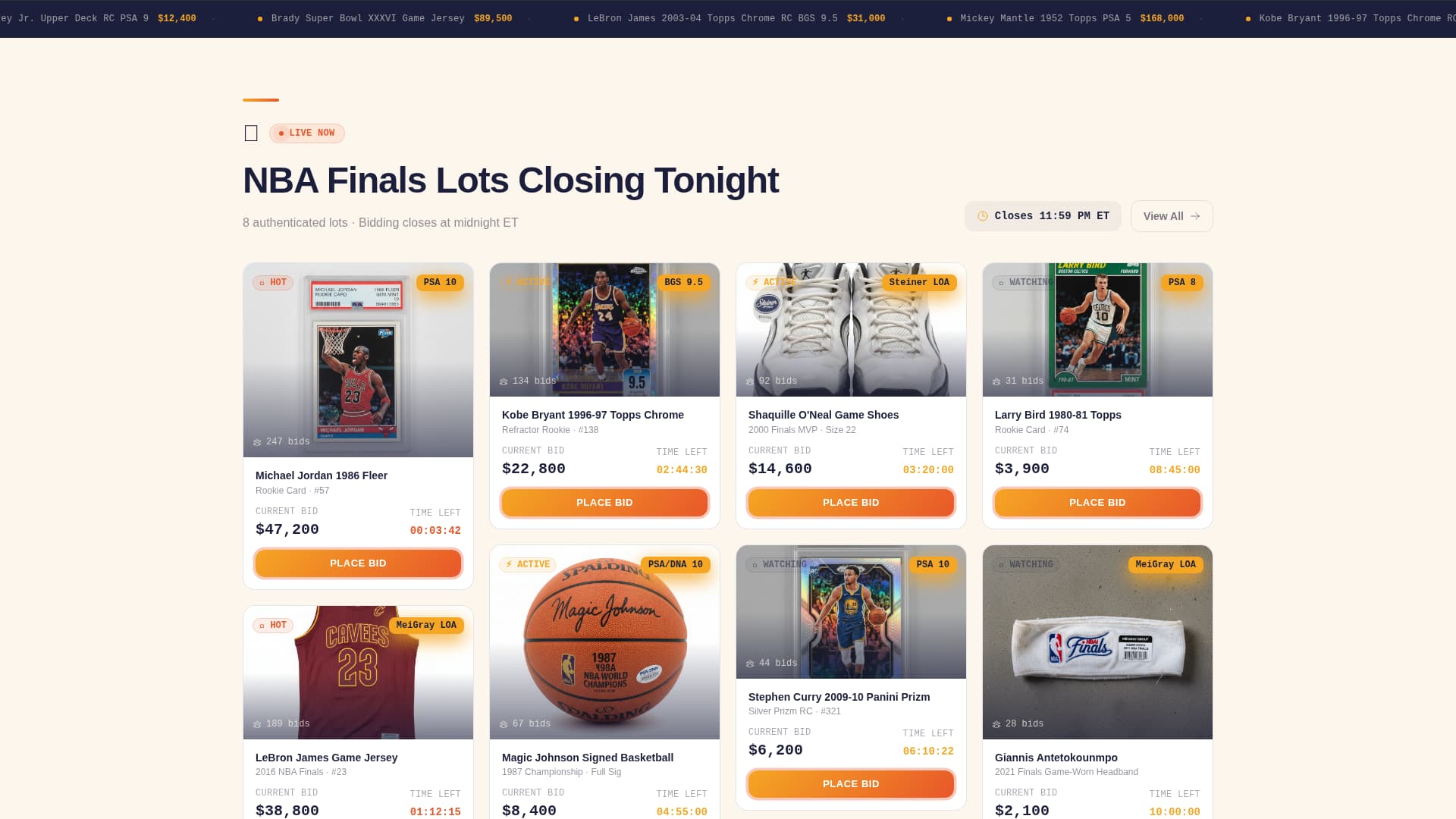 The masonry grid below the fold updates its curation to match the sports calendar. Basketball lots surface during playoff season, baseball inventory during summer, and so on. Each card in the grid shows a thumbnail, current bid amount, time remaining, and a lot heat indicator.
