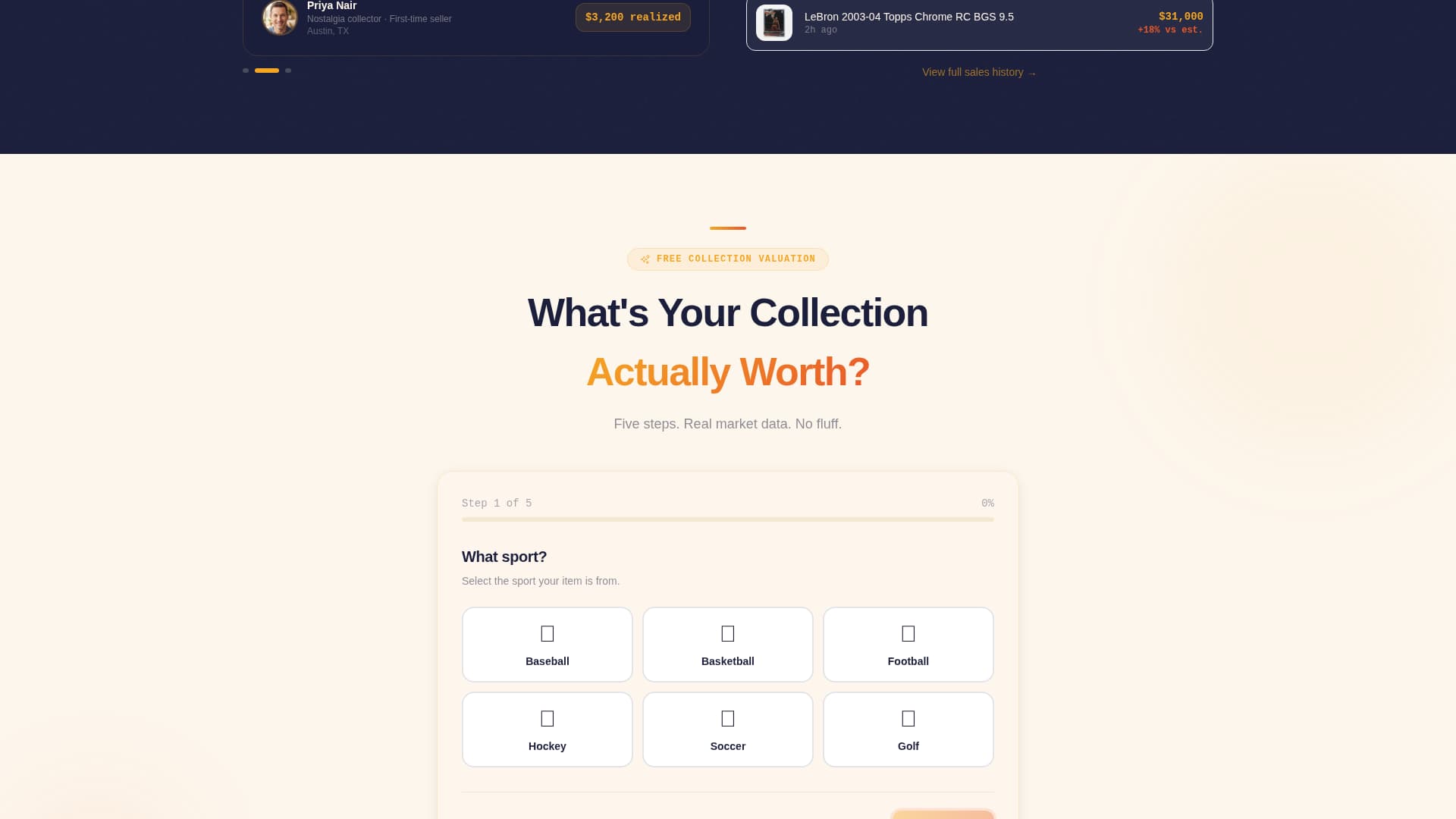 The primary call to action launches a guided quiz covering sport, era, item type, condition, and a photo upload step. Each step surfaces live market context so the visitor learns while they qualify. It functions as a consignment intake disguised as an engaging tool.