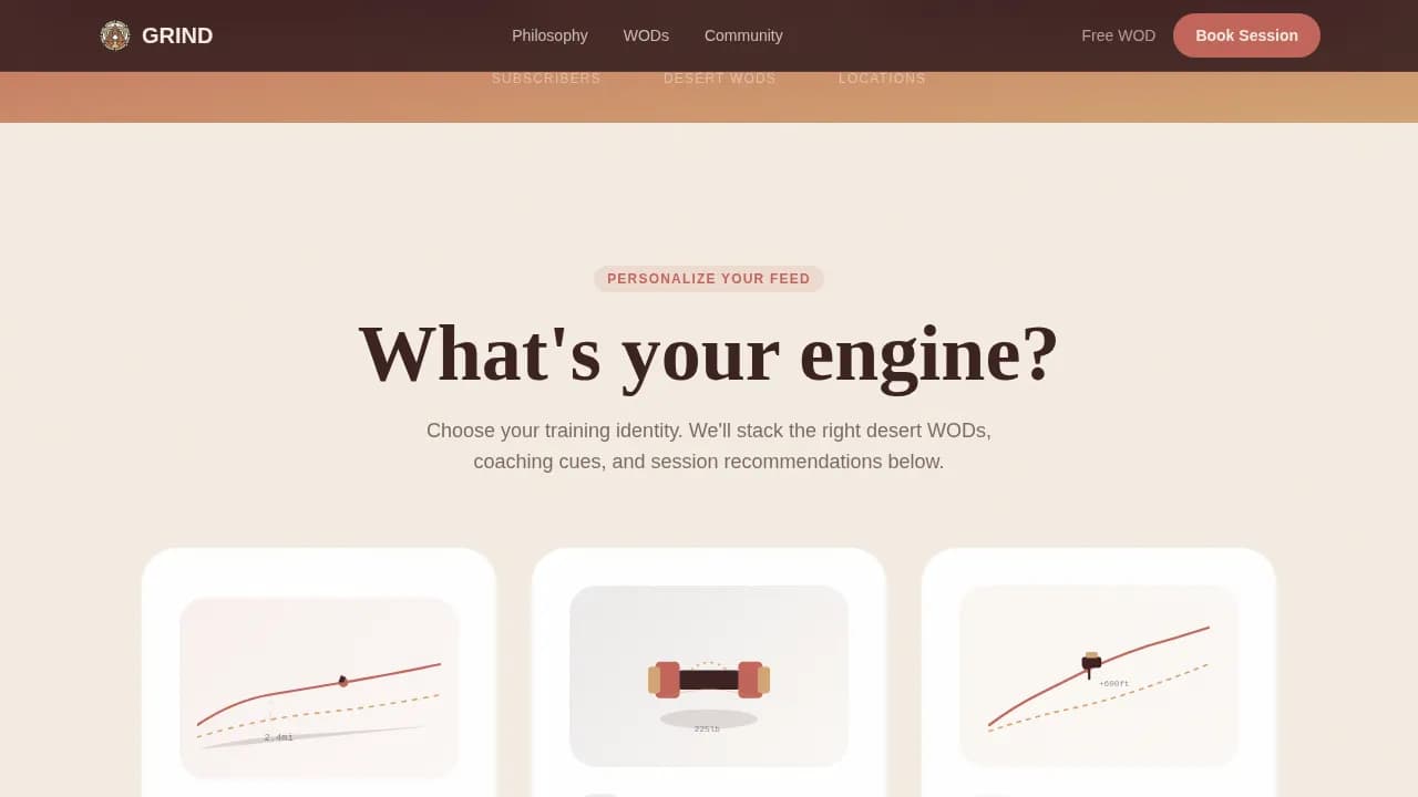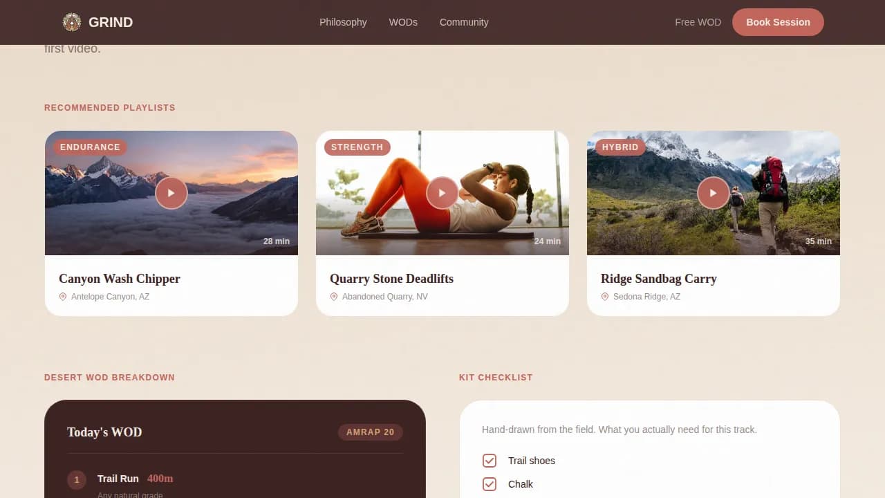 Grind is a scroll-reveal adventure landing page built for a CrossFit YouTube channel that trades the gym floor for canyon washes, desert trails, and abandoned quarries. It combines an animated field-journal illustration header, a personalized quiz engine, terrain-matched video playlists, postcard-style testimonials, and a booking section with three session types, all wrapped in a sun-baked Desert Rose color system.