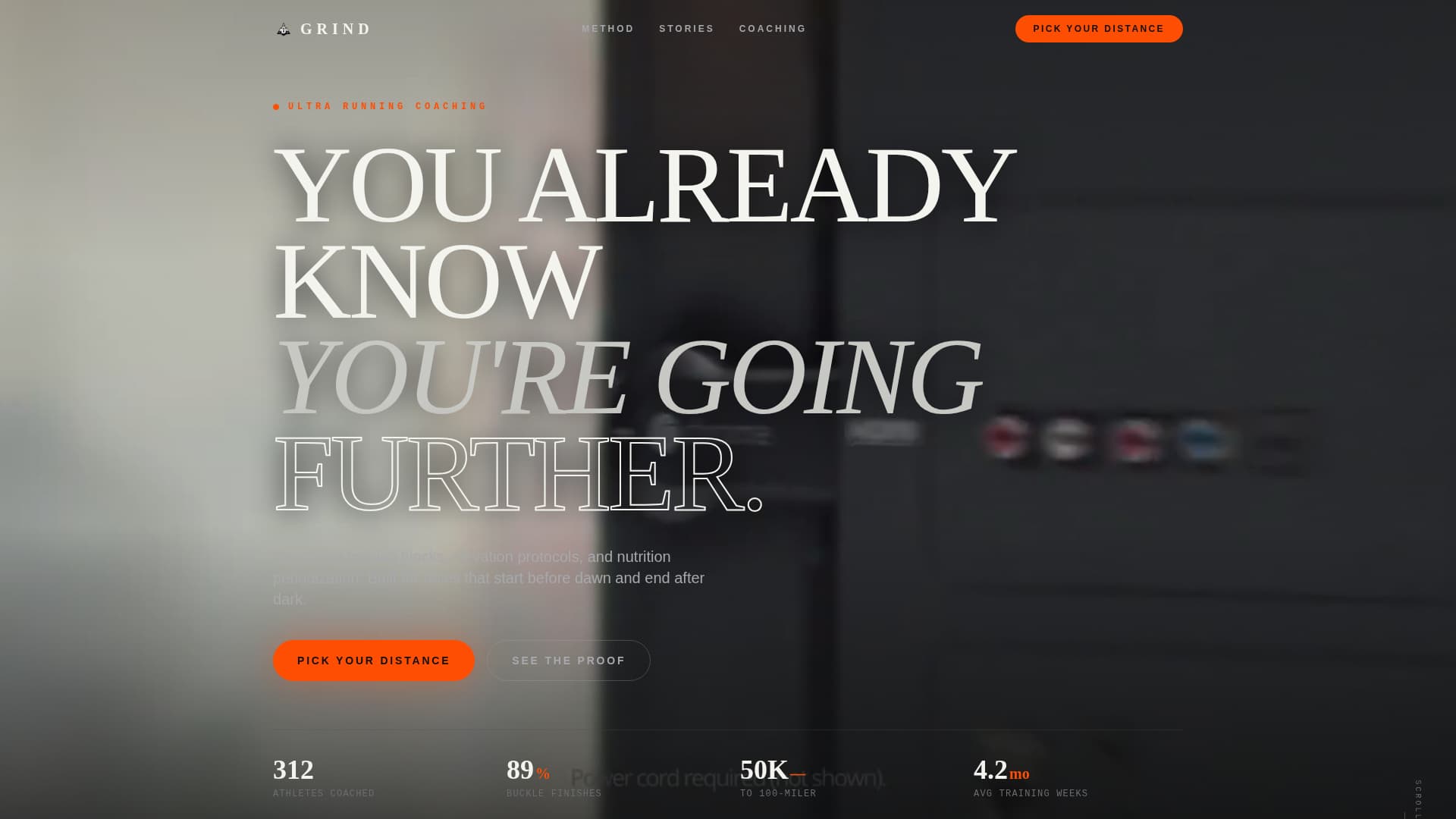 Grind is a storybook landing page template designed for ultra running coaches. It opens with chest-height trail footage and knockout typography, then scrolls through athlete transformation stories and three coaching tiers. Every section is built to move a hesitant runner from "maybe someday" to "I'm signing up now."