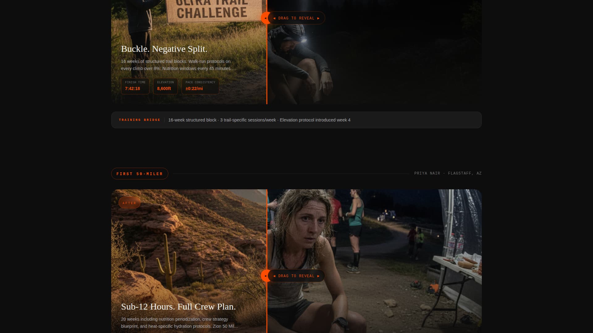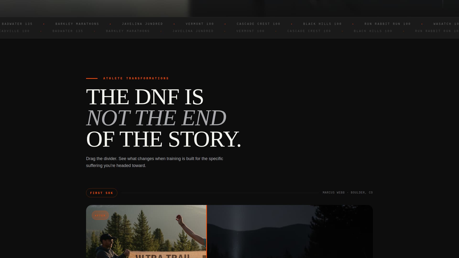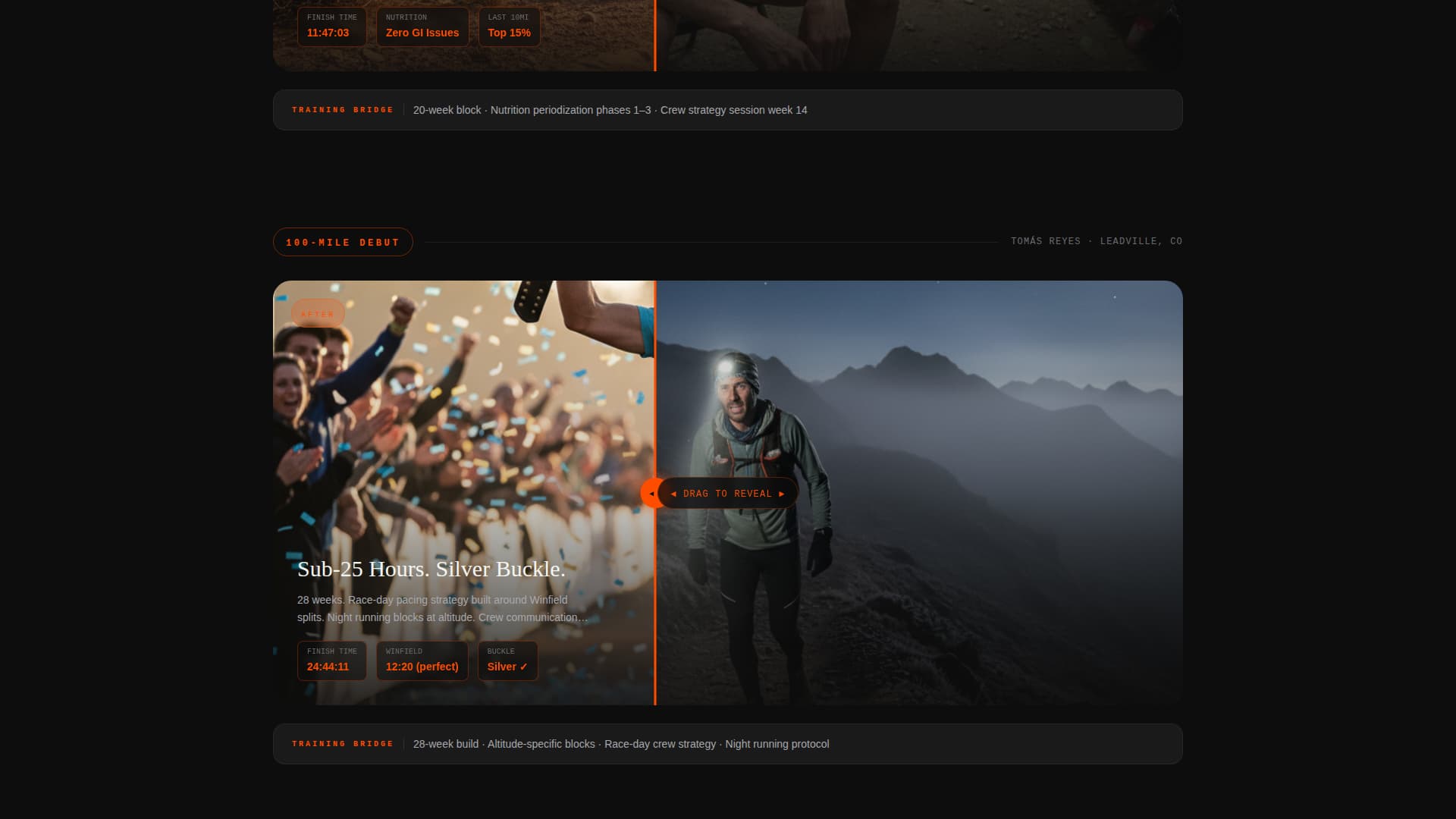 Each full-page section presents a runner's transformation as a split narrative. The left side shows the DNF moment with Garmin data, the right side shows the buckle finish. An interactive drag between the two sides reveals the training plan that bridged them.