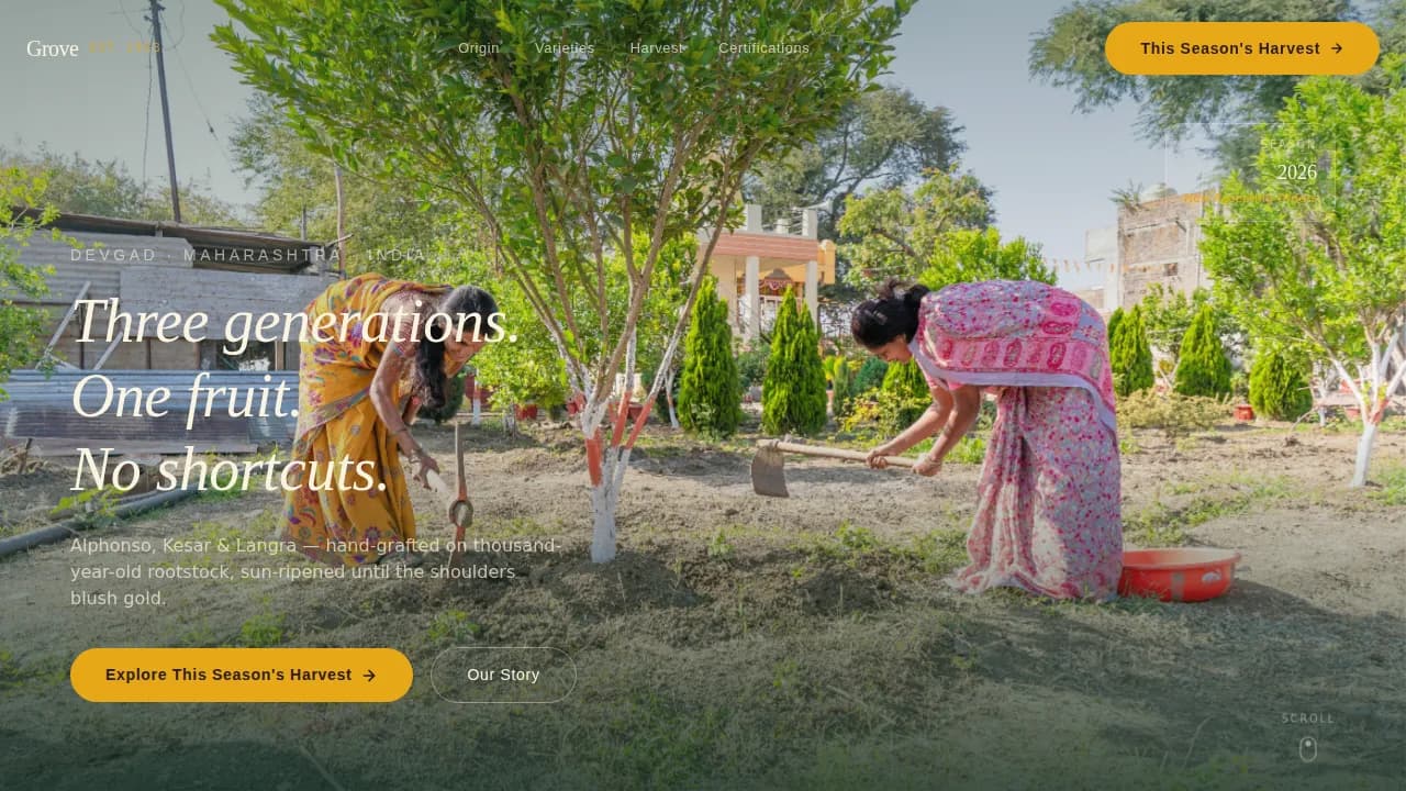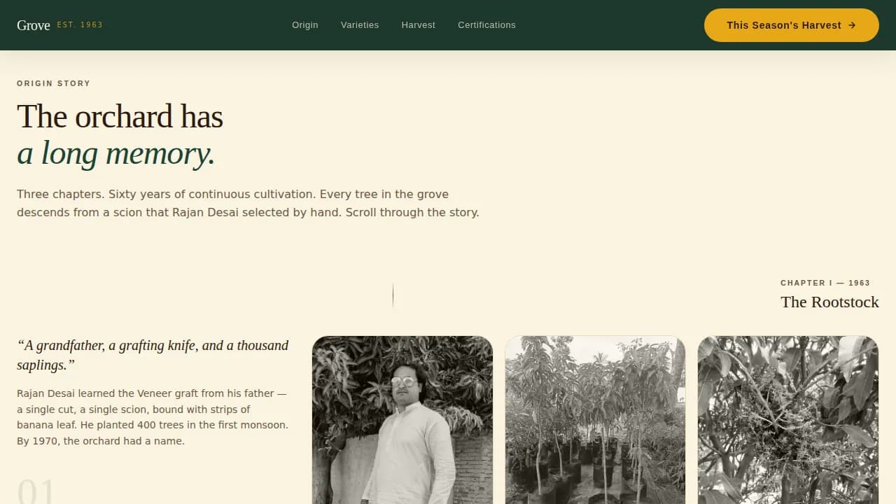 Grove is a cinematic, card-grid mango plantation landing page template built for single-origin farms that need to earn buyer trust before the click. It tells a three-generation origin story through scrolling archival and harvest photography, displays Alphonso, Kesar, and Langra variety cards with Brix readings and GI certification badges, and closes with a bold amber call-to-action directing buyers to a seasonal catalog.