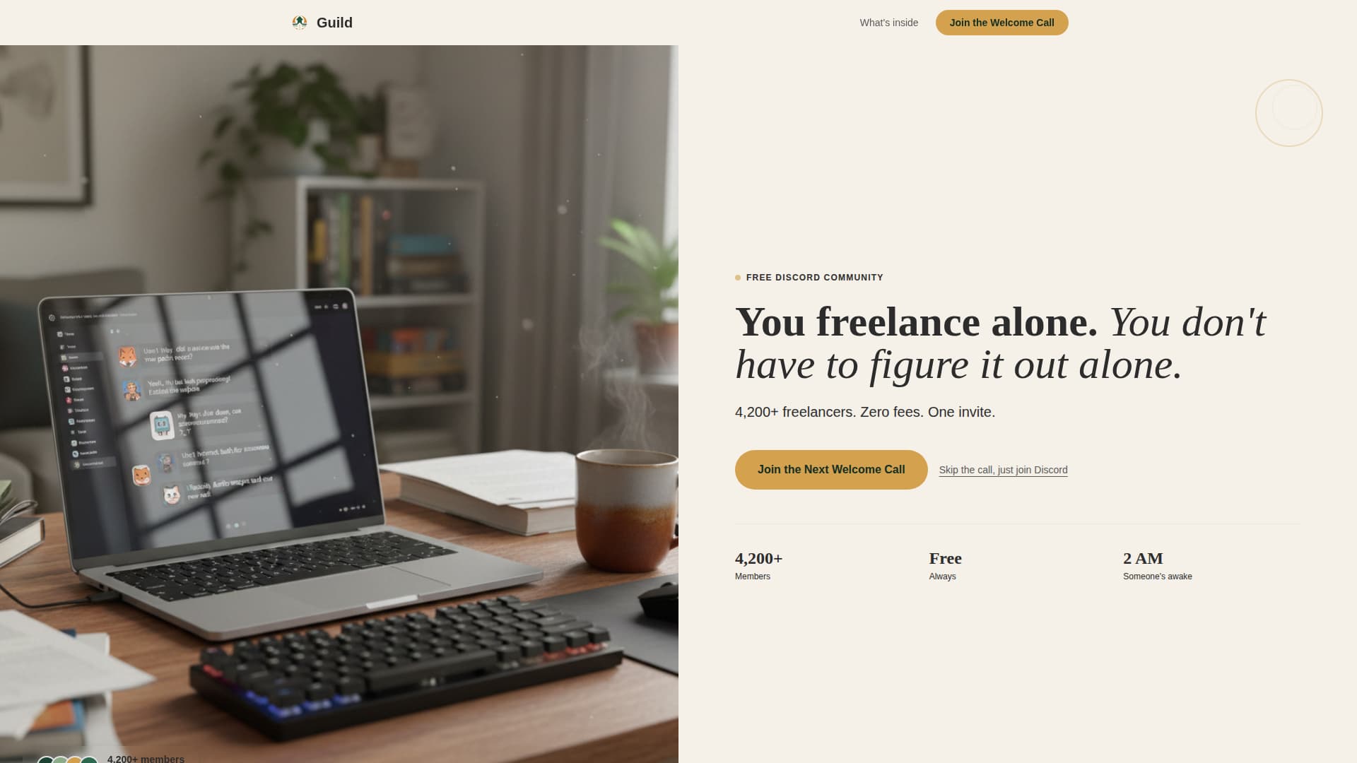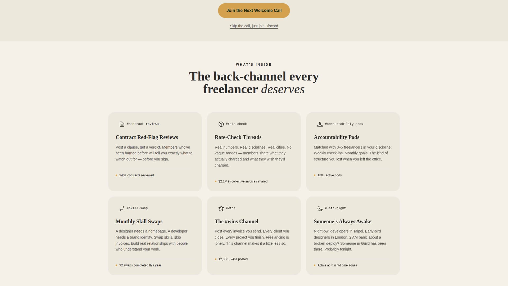 The signup form asks for first name, freelance discipline via a dropdown, and email address. Nothing else. A secondary text link below the form reads "Skip the call, just join Discord," giving already-convinced visitors an even faster path in.