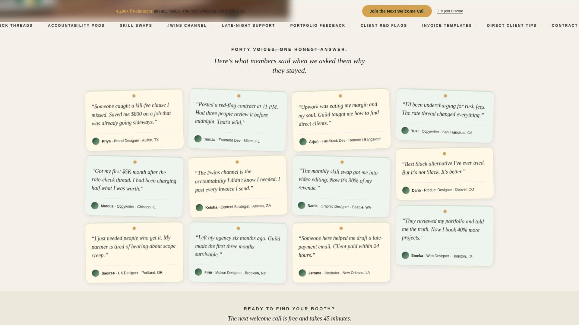 Guild is a single-column landing page template for a free freelancer Discord community. It leads with a candid split-photo header, builds social proof through a dense testimonial mosaic, and converts visitors with a three-field onboarding call signup. The Forest Trust color system and Civic Service visual theme make the whole page feel warm, human, and worth sticking around for.