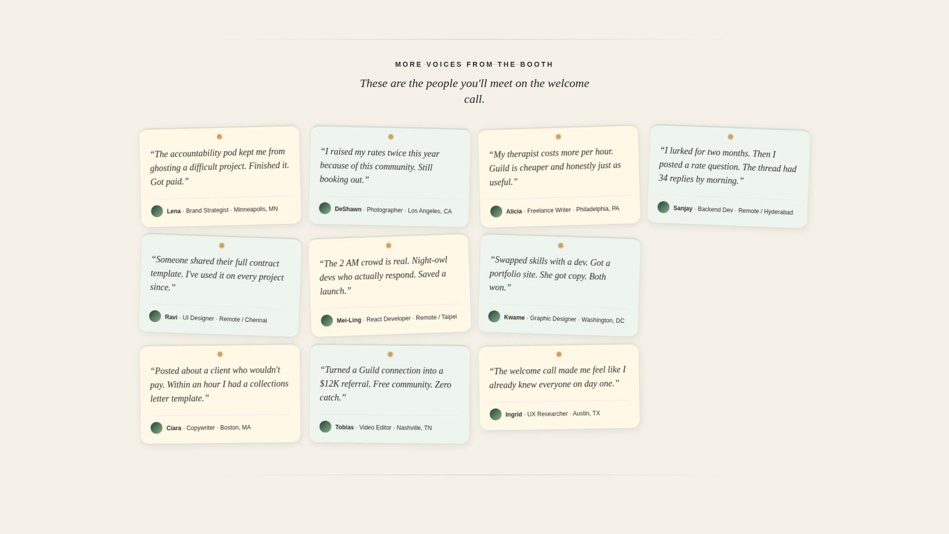 | Testimonial Mosaic II | Deepen trust with a second, denser wave of member voices |