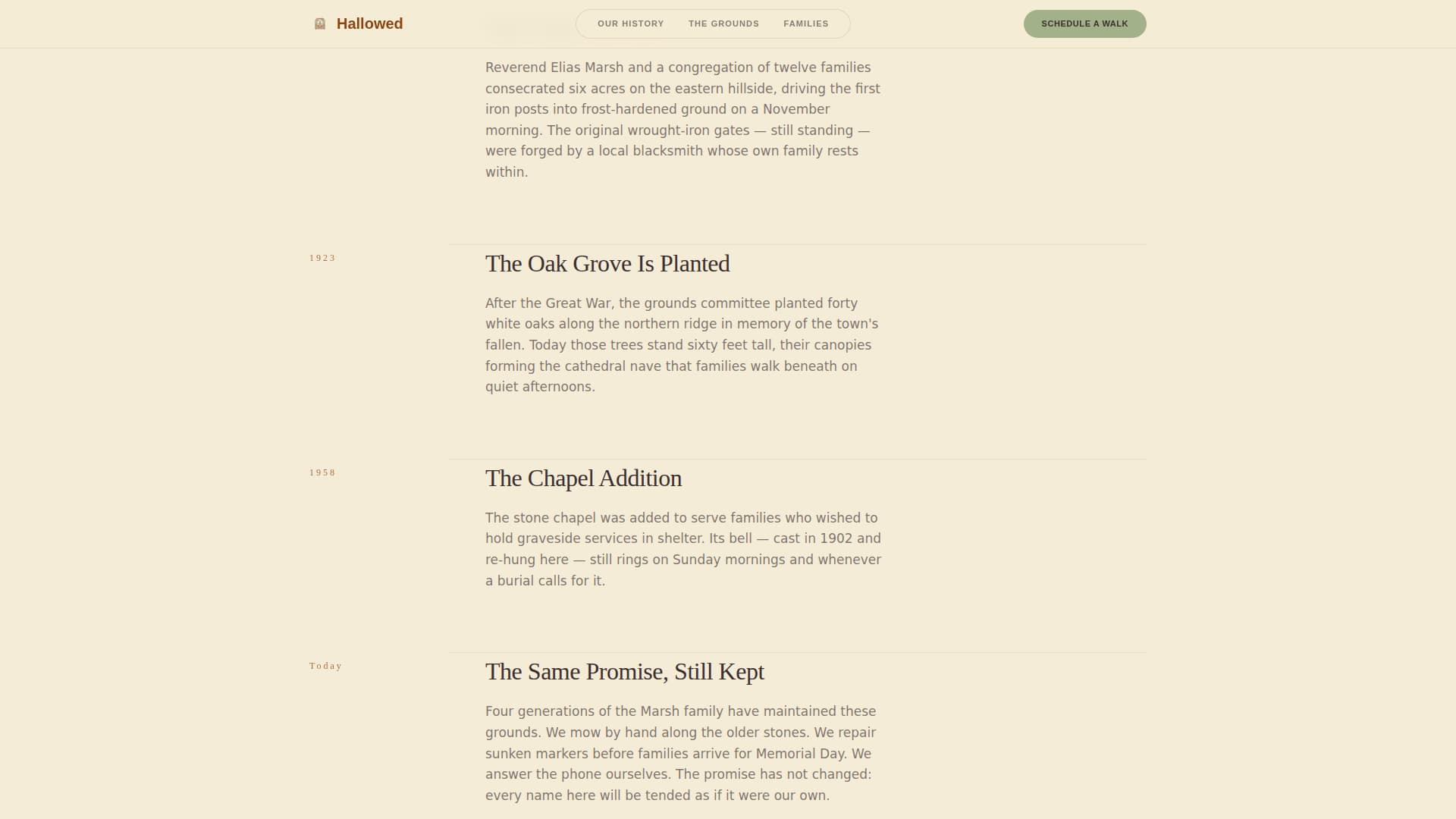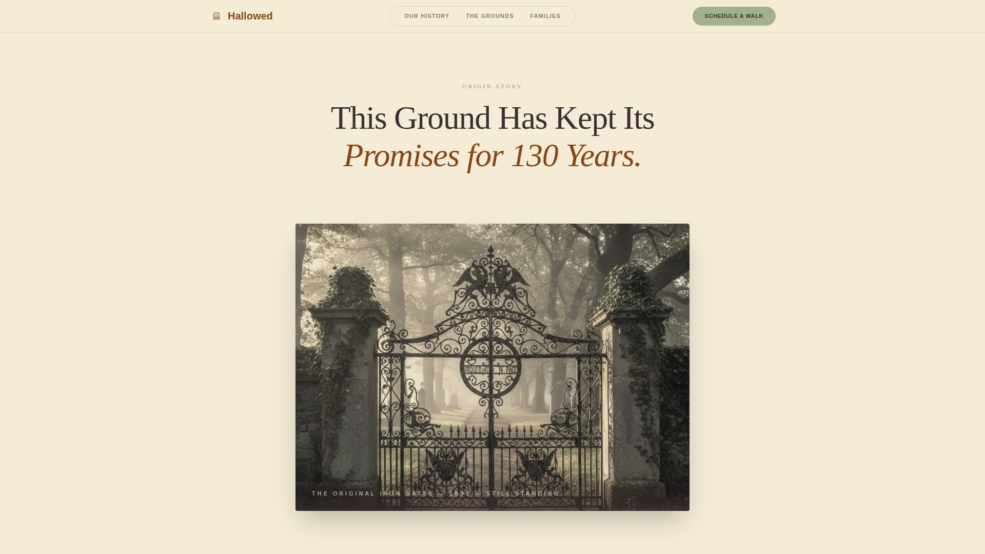 Hallowed is a full-page, single-scroll landing page template for traditional cemeteries. It opens with a monumental serif headline, unspools a founding history decade by decade, and earns the visitor's trust before asking anything of them. By the time the booking form appears, scheduling a walk feels like a natural next step, not a sales call.