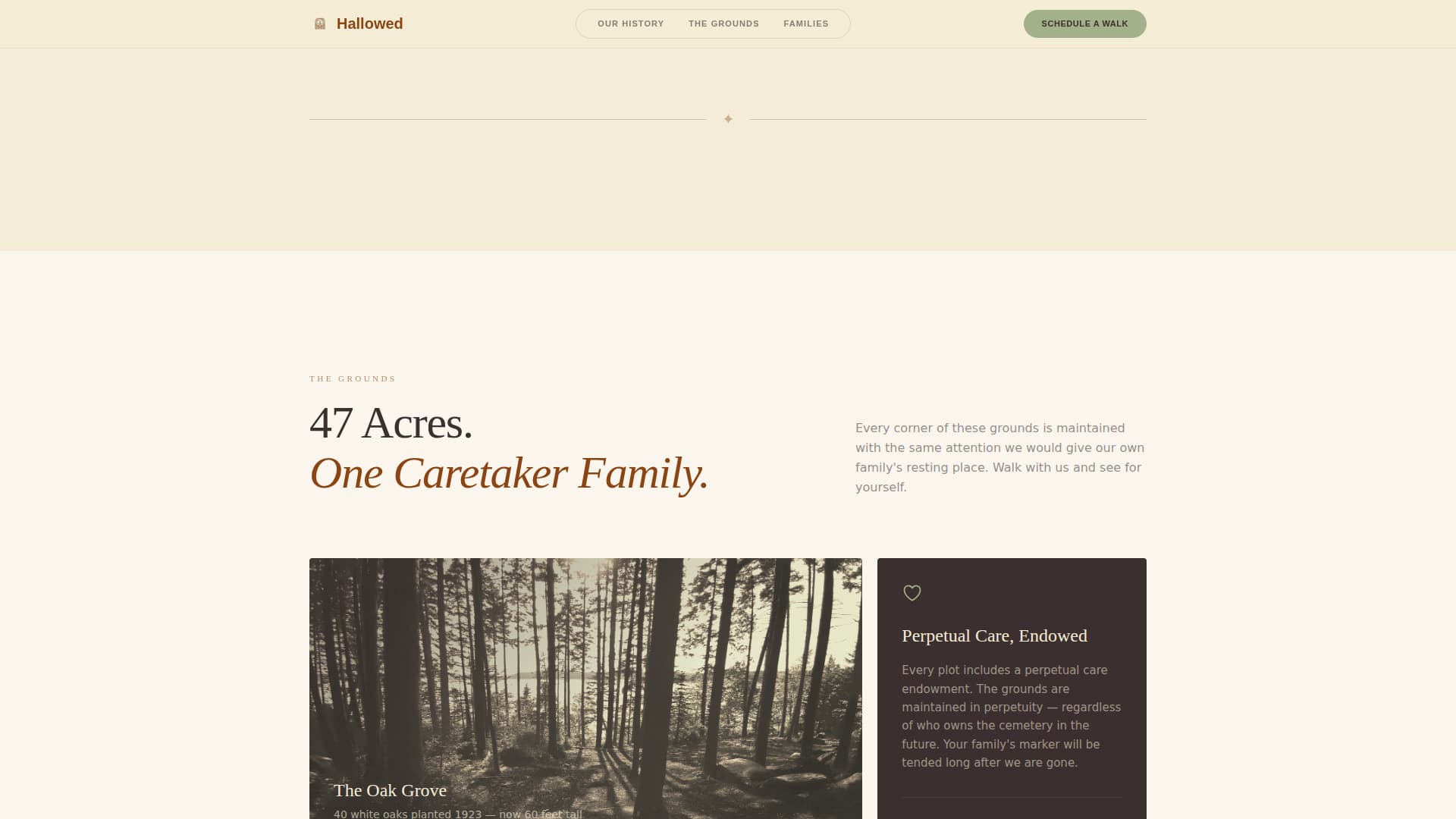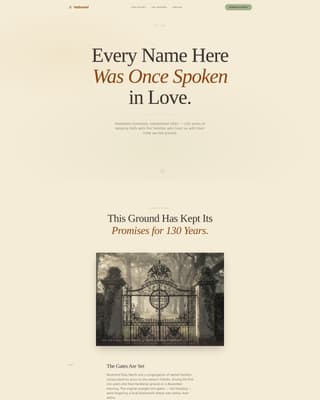 Hallowed is a storybook landing page template built for traditional cemeteries. It tells a century-long story of stewardship, guides visitors through the grounds, and closes with a gentle booking form framed as a quiet personal walk. The Pastoral Calm design uses parchment, rust, and sage tones to feel unhurried, warm, and deeply trustworthy.