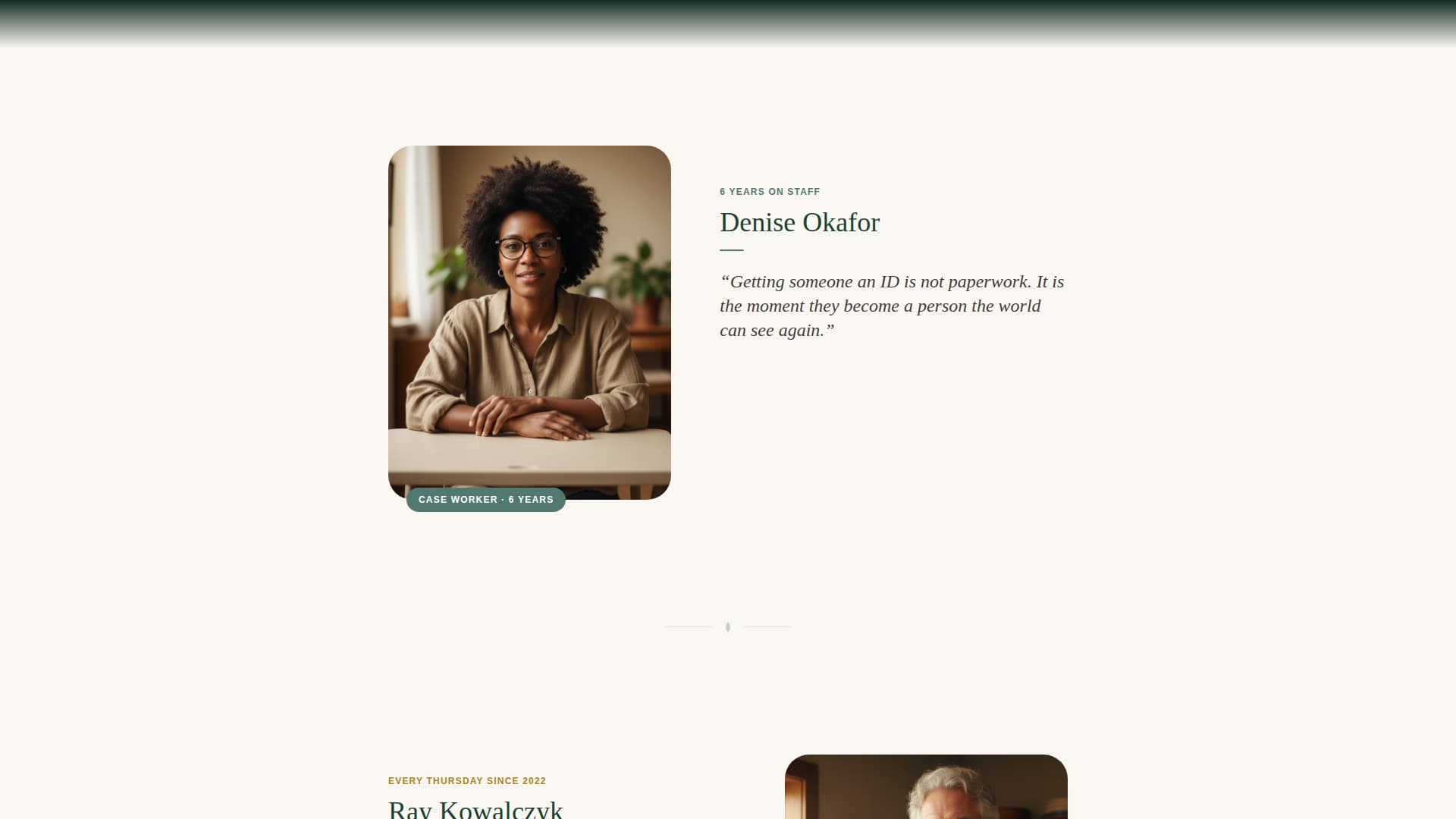 Each scroll section focuses on one person: a case worker, a kitchen volunteer, or a former resident now on staff. One person, one story, one photograph per section. The accumulating effect builds a living picture of the shelter as a network of human hands rather than an institution.