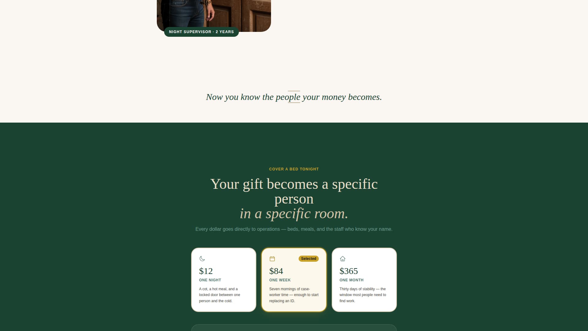 Three selectable cards display real, itemized costs: $12 covers one night, $84 covers one week, $365 covers one month. The primary call to action reads "Cover a Bed Tonight." A single-field email and payment form keeps the path to giving short and clear.